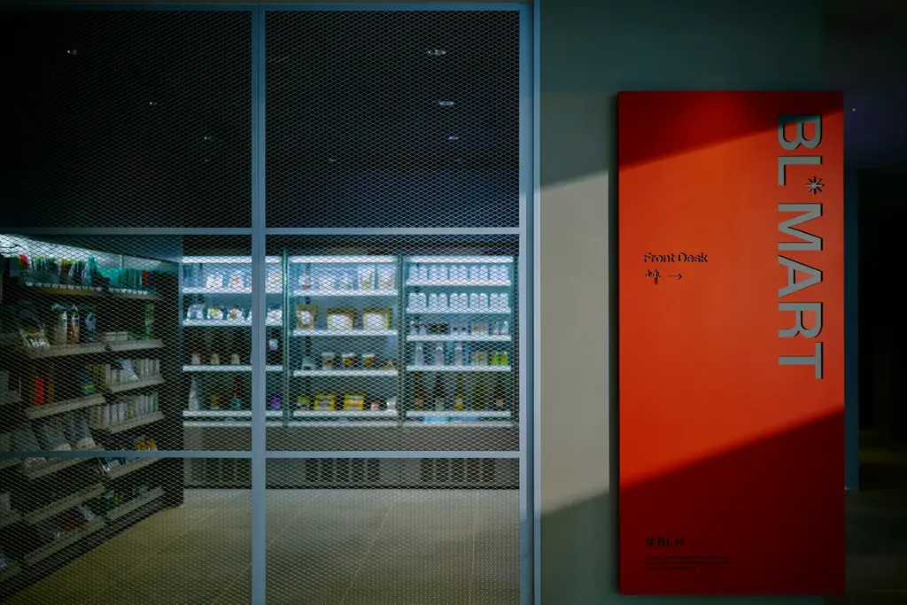 無人コンビニ「BL*MART(ビーエル マート)」は24時間利用可能なキャッシュレス決済のコンビニエンスストアで、BASE LAYER HOTELの世界観を反映した商品構成が特徴です。ホテルオリジナルグッズに加え、JASON MARKKのシューケアセット、福岡県糸島の酒店「川久保酒店」がキュレートしたドリンク、九州のローカルスナックなどのセレクト商品をそろえています。宿泊者だけでなく地域住民にも開かれた場として位置づけられます。