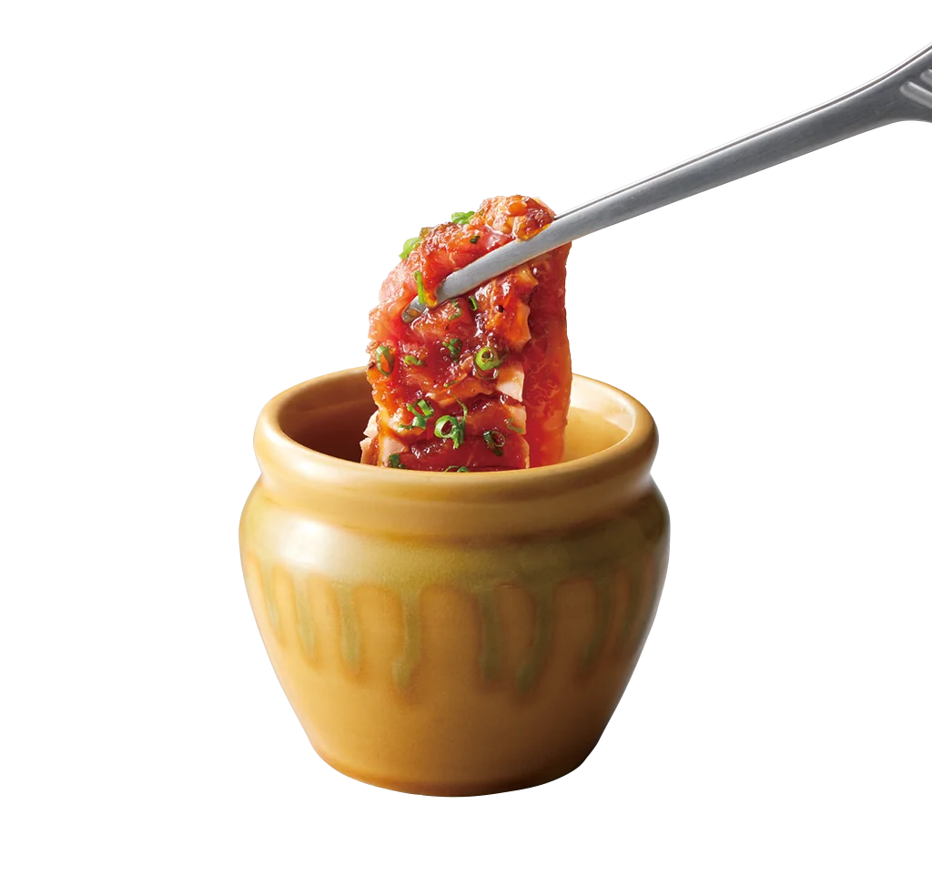 - デジカルビの名店『青松』公認のタレで漬け込んだ逸品。野菜とフルーツの自然な甘味と柔らかさが特徴。