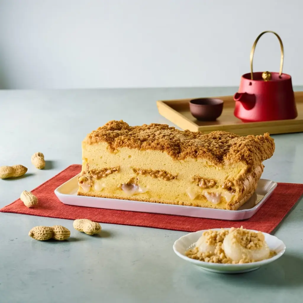 『台湾ピーナッツ餅カステラ』は、台湾の伝統的なスイーツである「花生餅(ピーナッツ餅)」と日本のカステラ文化を融合させた商品です。特徴は、「伸びる羽二重餅」と「濃厚なピーナッツ餡」、さらに「サクサクのピーナッツクランチ」を組み合わせることで生まれる、多層的な食感のバランスにあります。