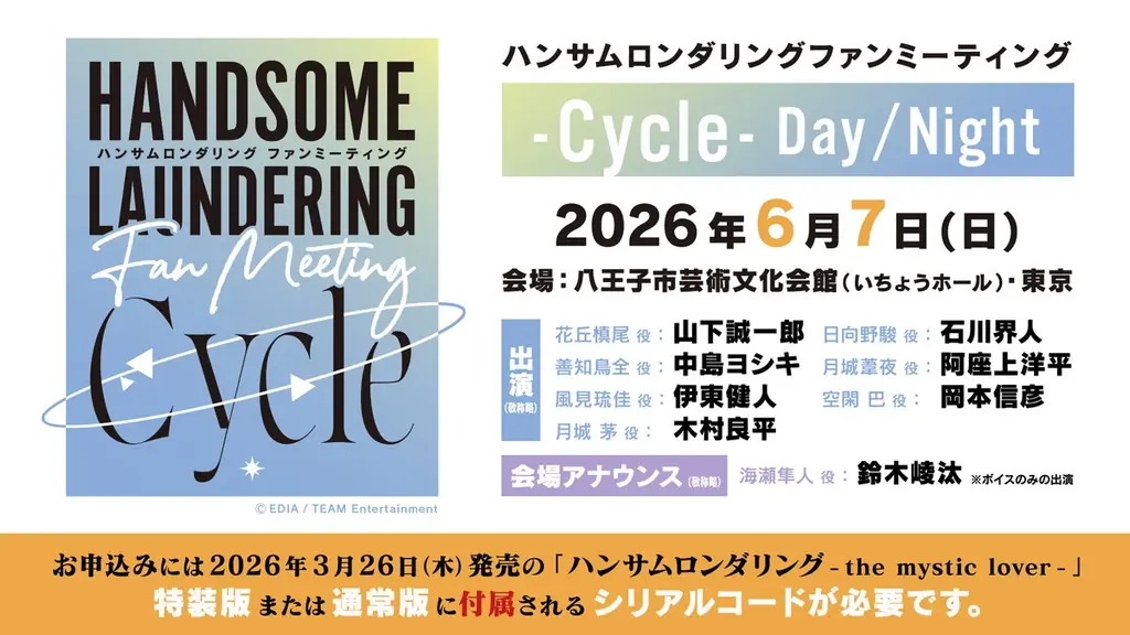 発売を記念して開催されるリアルイベント『ハンサムロンダリング ファンミーティング -Cycle-』は、2026年6月7日(日)に八王子市芸術文化会館(いちょうホール)で行われます。公演は昼・夜の2回で、昼公演は13:30開演、夜公演は18:00開演です。