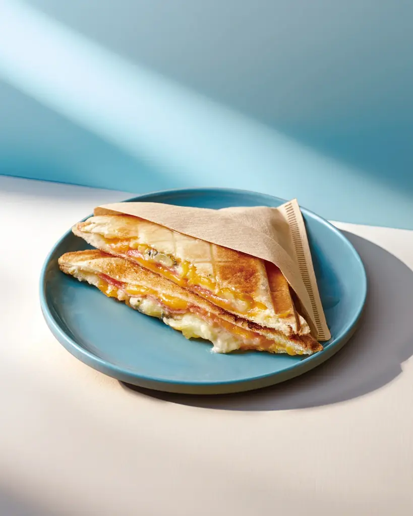 内容:外は香ばしく焼き上げたホットサンド。中身はチェダーチーズ、ブルーチーズ、厚切りベーコン、ポテトサラダの4種が入っており、仕上げにハチミツを加えることで甘じょっぱさを生み出す一品です。とろけるチーズのコクとベーコンの塩気、ポテトサラダのやわらかな食感が組み合わさった、温かく軽やかな味わいを意図しています。