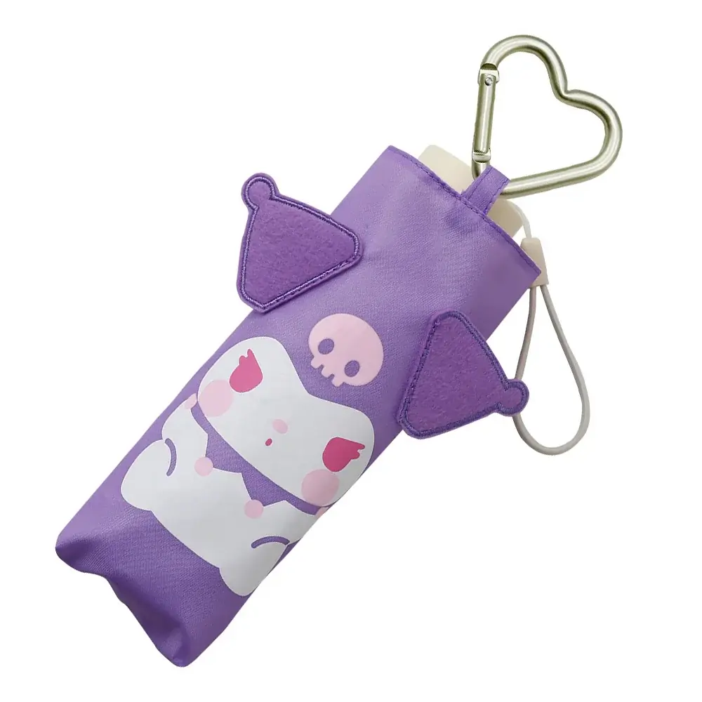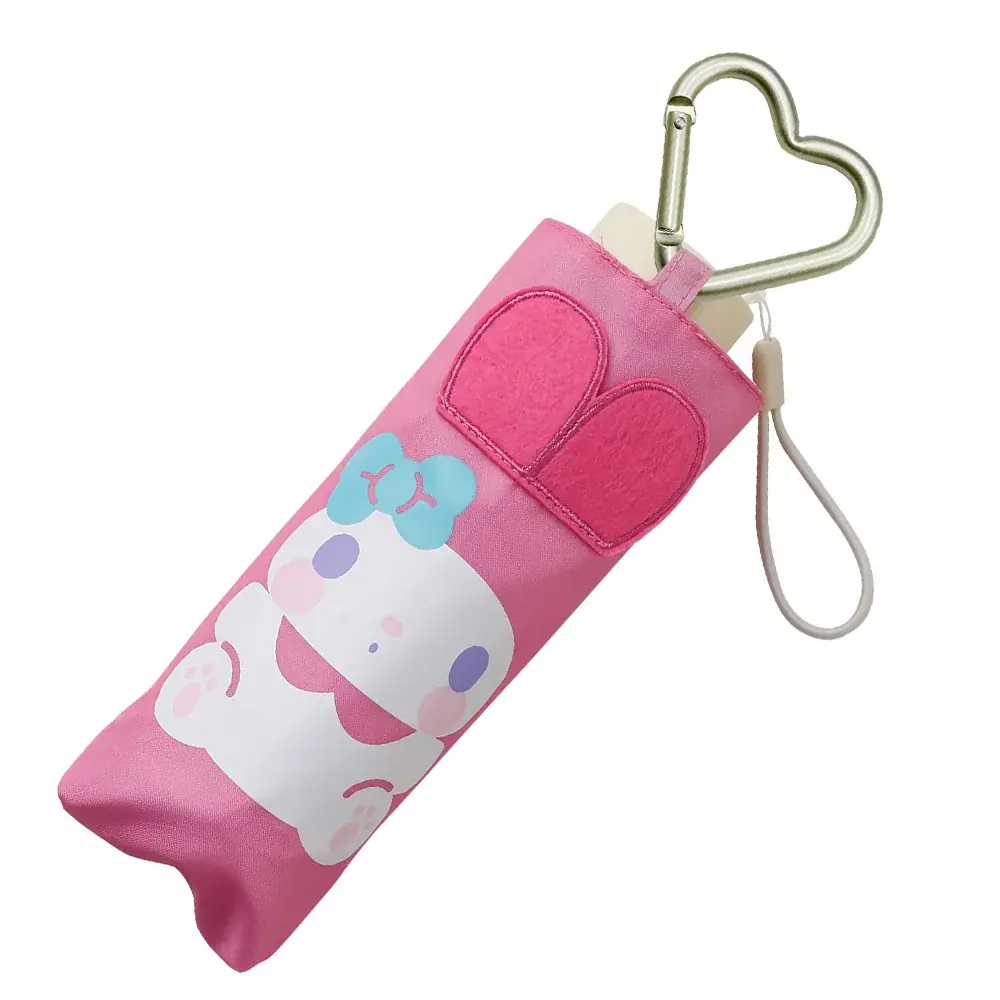 また、収納袋にはハート型のカラビナが付属しており、リュックやカバンの持ち手などに取り付けられる設計です。これにより、外出時にバッグに入れても、バッグの外側に付けておいても目を引く見た目となります。傘本体の色はベースをホワイトに統一し、キャラクターのワンポイントネームが配されたシンプルなデザインです。
