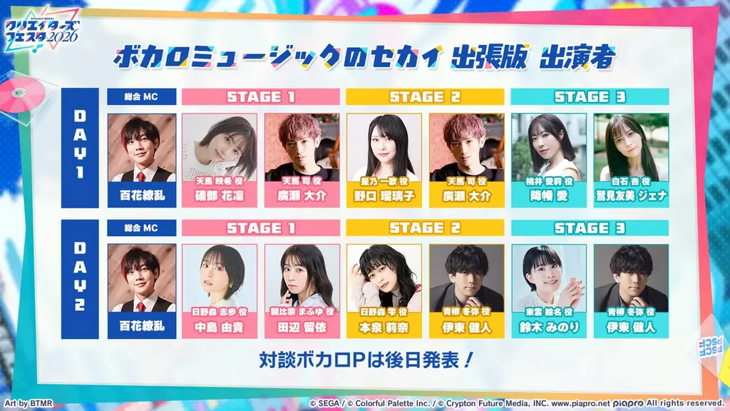 出演者の一覧は以下の通りです。対談で登壇するボカロPは後日発表されます。各ステージの開始時間は予告なく変更される場合があります。