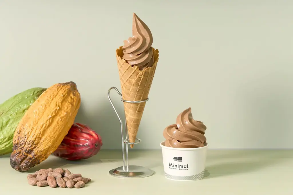 Minimalとして初の定番ソフトクリーム。高配合のガーナ産ダークチョコレートを主役に、シンプルなレシピでカカオの香りと深みを立体的に表現しています。食べごたえのある風味でありながら後味は軽やかに引いていく設計です。