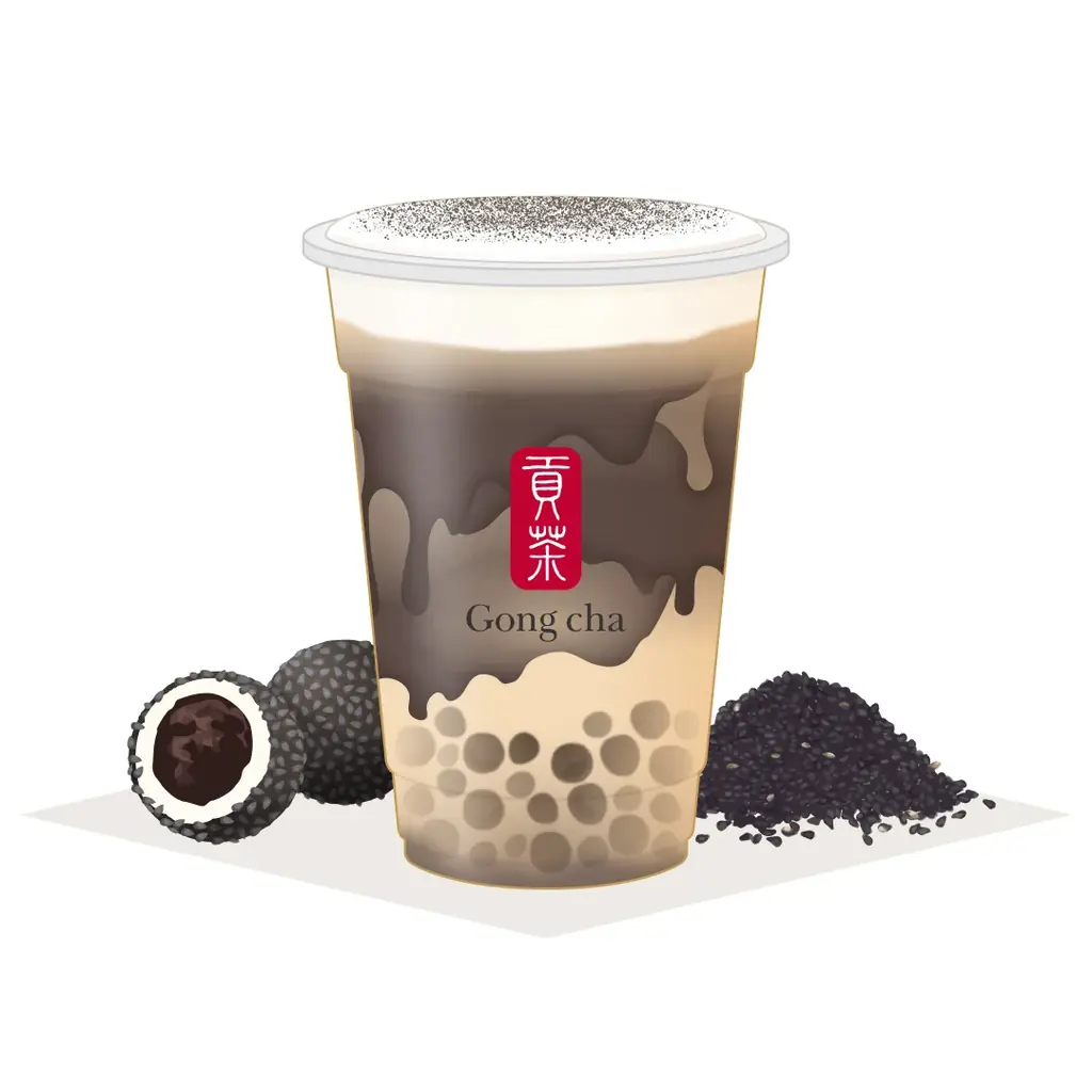 - 香ばしい胡麻と烏龍ティーがマッチするごま団子をイメージしたミルクティー。烏龍ミルクティーに黒胡麻あんペーストを合わせ、もちもちのパールとミルクフォームをトッピングし、食感と風味でごま団子を再現しています。