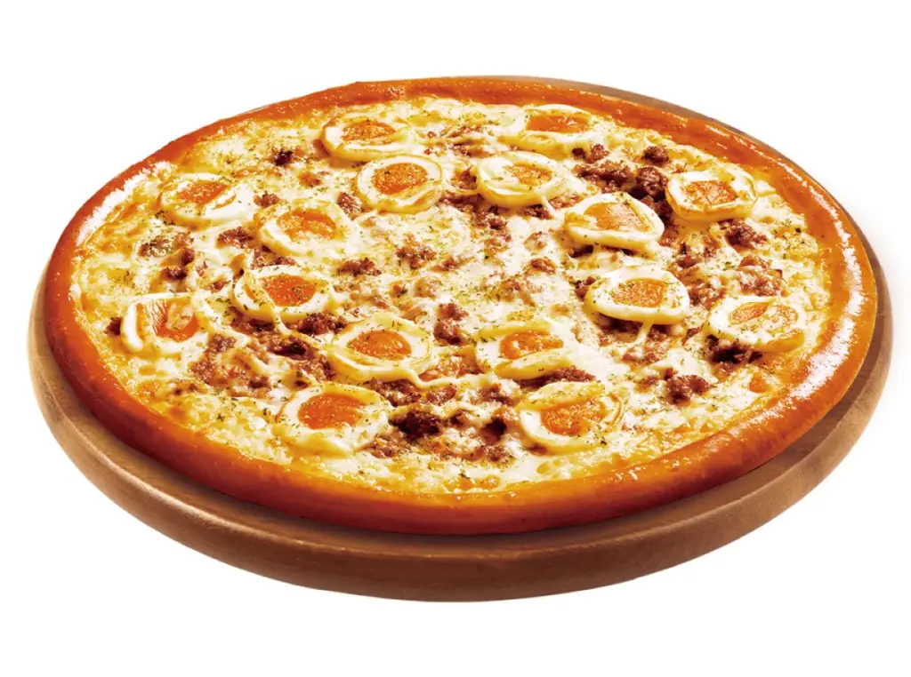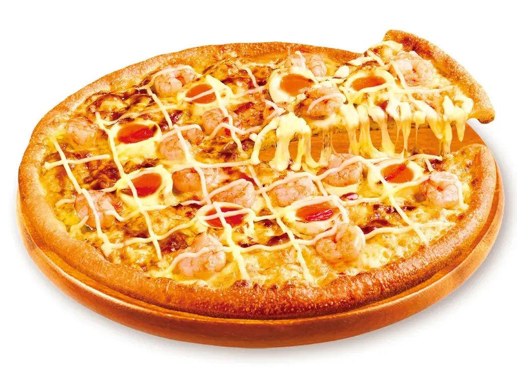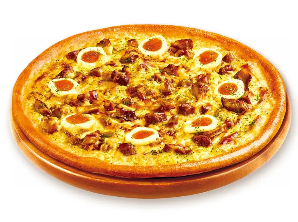 - てりたまシュリンプ:ぷりぷりのエビ、半熟風たまご、シャキシャキのオニオン、コク深いマヨネーズを組み合わせたクリーミーなピザ。