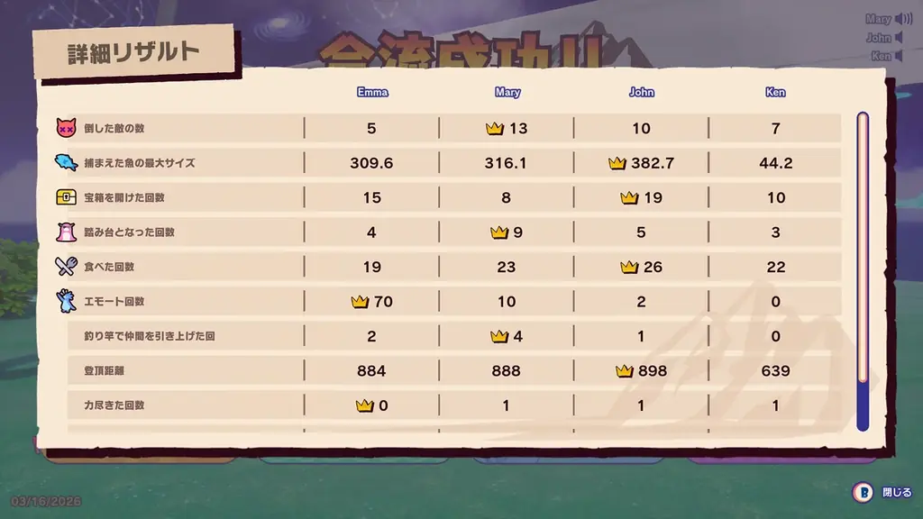 『ペンギン・クライマーズ』にはリザルト画面での貢献度表彰や限定ステッカーの獲得など、継続的に挑戦したくなる要素が組み込まれています。特定条件達成で限定ステッカーを獲得でき、リザルト項目で最も貢献したプレイヤーには王冠が授与されます。