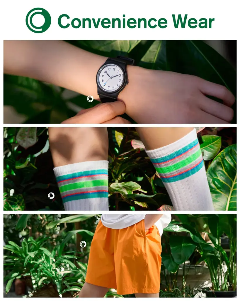 ブランドは2021年の立ち上げ以降、手軽で身近な品質を提供し、コンビニで衣料品を購入する文化を定着させてきました。2026年2月にはブランド初のTVCMを放映し、ブランド世界観を映像で表現。その成果のひとつとして、今回ブランド初の腕時計をはじめ、吸水速乾素材のショートパンツや晴雨兼用の傘、サンダルなど雑貨類が充実したラインアップで登場します。