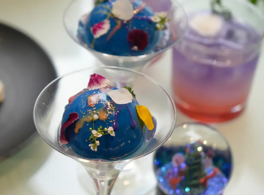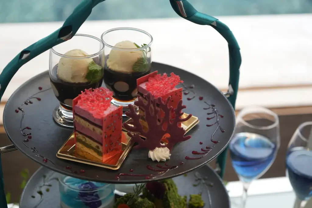 特に象徴的なのは、球体水槽を想起させるブルーのムースケーキと、和の空間「MIYABI-和と灯の間」をイメージした赤いさくらんぼのケーキです。味と食感のバランスにもこだわりが反映されており、甘味・酸味・塩味・食感の変化を含めた構成で、アフタヌーンの時間を彩ります。