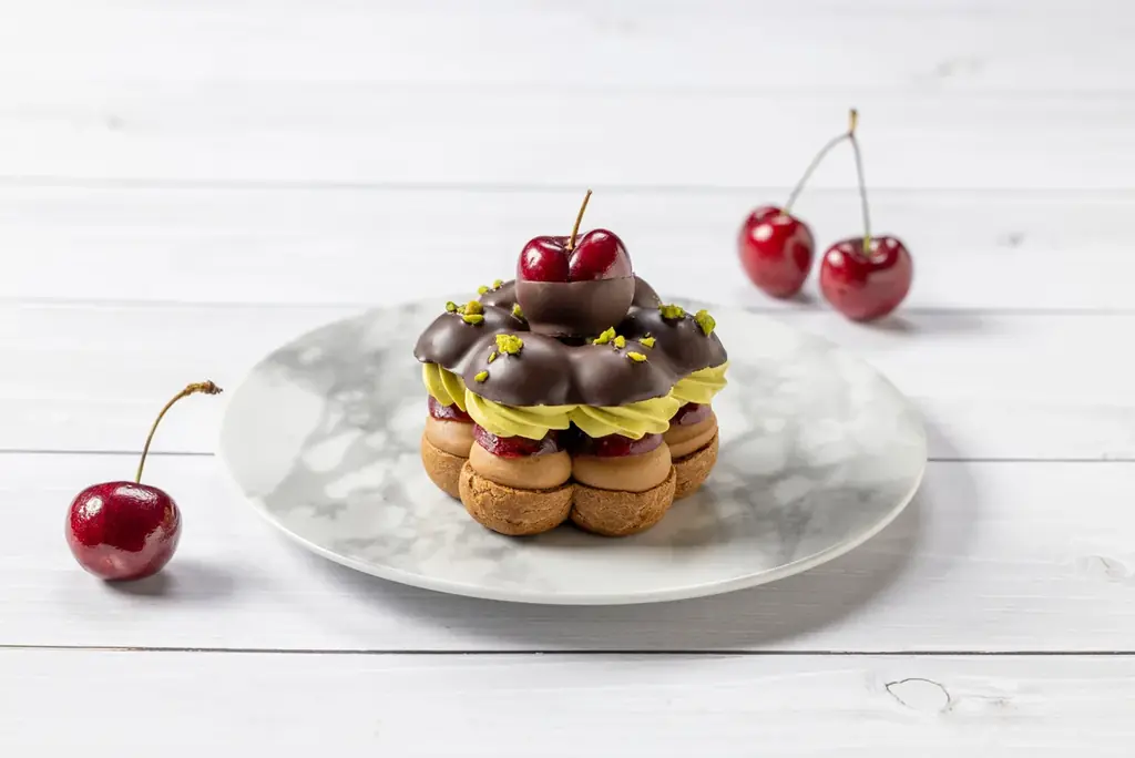 グリオットチェリージャム、チョコレートカスタードクリーム、フレッシュアメリカンチェリー、ピスタチオクリームをチョコレートでコーティングしたシュー生地でサンドしたパリブレスト。みずみずしいチェリーとピスタチオの風味、シューの食感を組合せ。