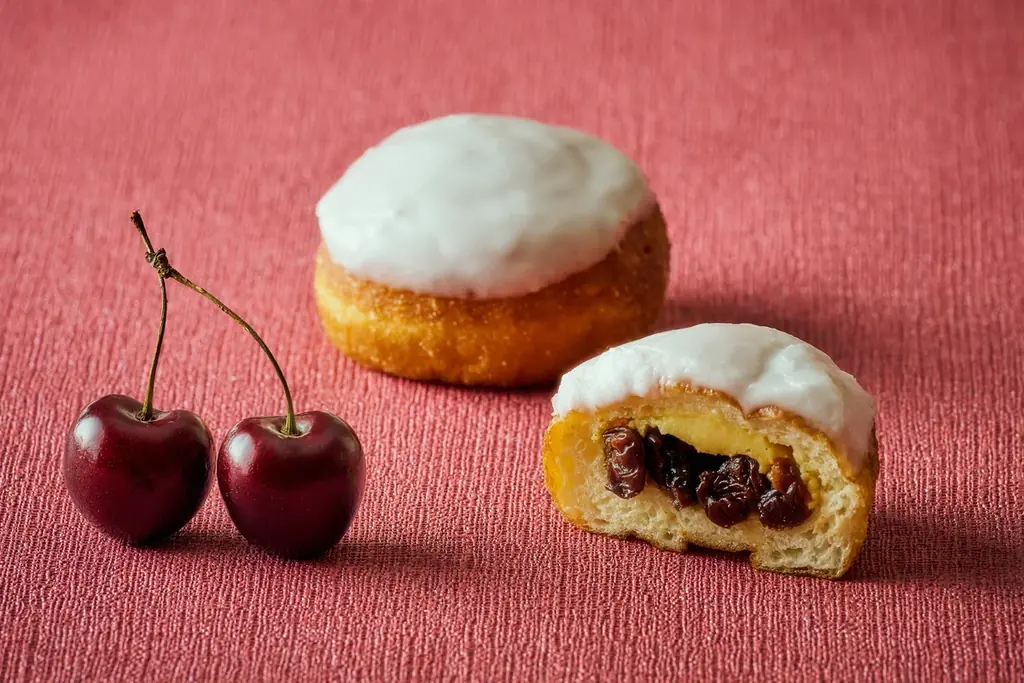 ふんわりとしたドーナツ生地の中に、キルシュに漬け込んだドライチェリーとクリームチーズを合わせたカスタードクリームを包む。チェリーの甘酸っぱさとキルシュの芳醇な香りが余韻まで続く、大人向けの味わい。 - チェリーブリオッシュ 500円 ★新作