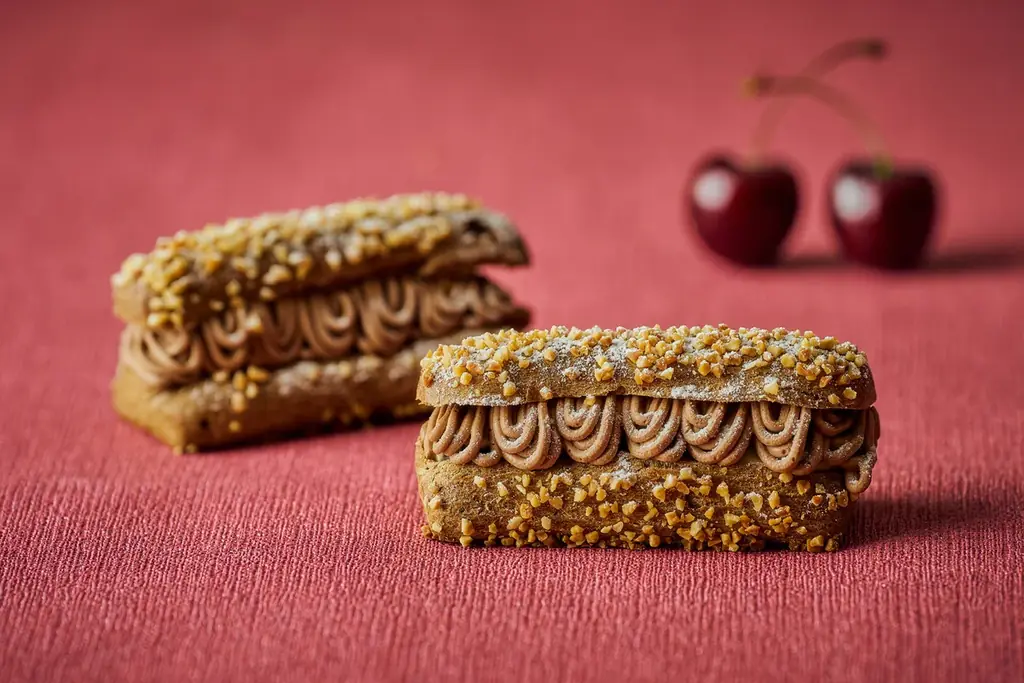 ローストアーモンドをまぶしたチョコレートのシュー生地に、グリオットチェリーのコンフィ、軽やかなディプロマットクリーム、フレッシュチェリー、濃厚チョコレートクリームを詰めたエクレア。現れる酸味とチョコレートのコク、サクッとした食感の調和を意図。 - アマレーナ 4,800円(ホール/12cm)、800円(ピース/6cm) ★リニューアル