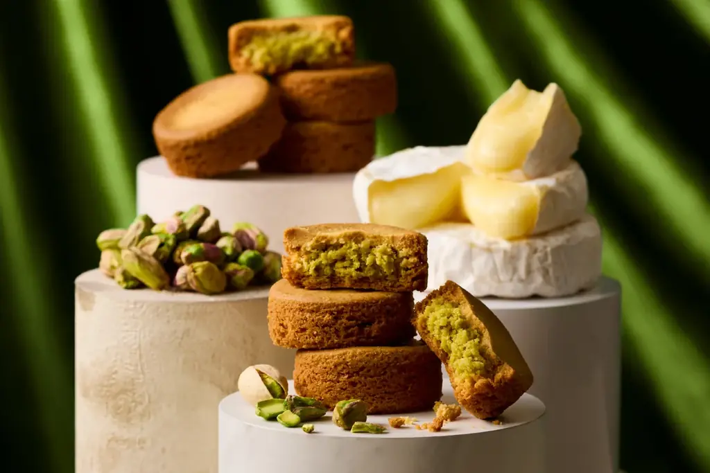 | 商品特徴 | サクッ、ホロッのガレット生地にカマンベールチーズパウダーとピスタチオを組合せ。ピスタチオの豊かな風味とチーズの旨みが重なる味わい。 |
