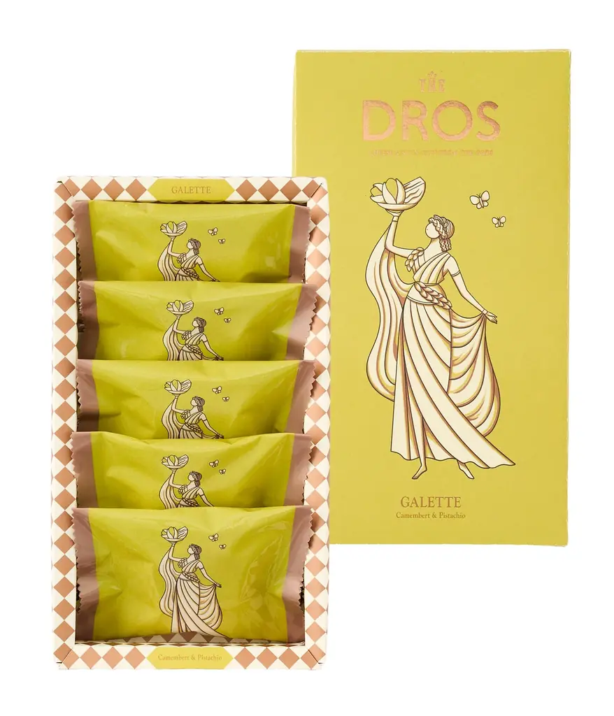 パッケージは味わいが伝わるように「ピスタチオカラー」を採用。中央にはTHE DROSの象徴である女神を配し、右手にピスタチオとチーズを掲げる図案で春の訪れを表現しています。ギフト用途や手土産として店頭で見つけやすいデザイン設計です。