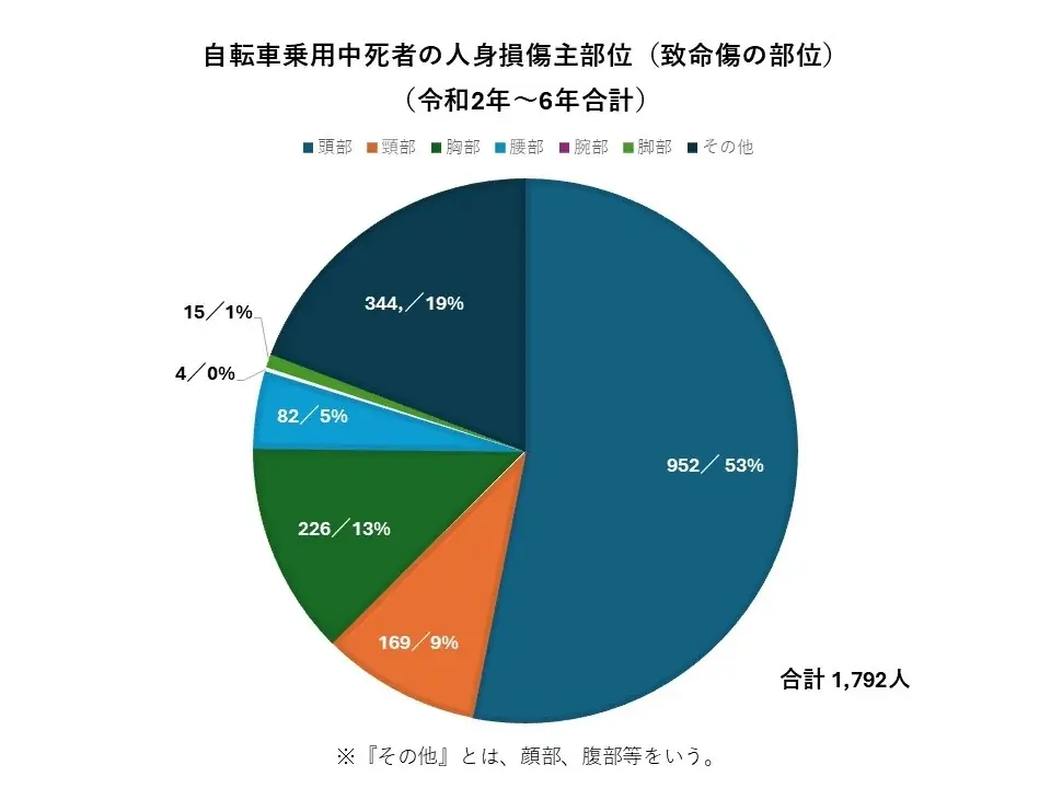 警察庁の統計によれば、ヘルメット非着用者は着用者に比べて致死率が約1.5倍以上であり、自転車事故で亡くなった方の約53%が頭部損傷を負っていると報告されています。これらの数値は、本人の安全確保の観点からヘルメット着用がいかに重要であるかを示しています。