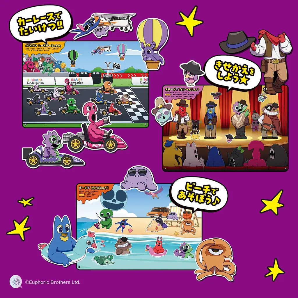 本書は7つのシーンに合わせてシールを貼って遊ぶ構成になっている。7つのシーンは、キャラクターずかん/レストラン/ビーチ/レースサーキット/きせかえショー/おやすみなさい/バンバンワールドで構成されており、それぞれ異なる遊び方が用意されている。