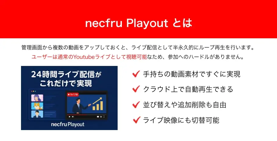 「necfru Playout」は動画素材をアップロードするだけでYouTube Live上での常時配信を実現するサービスであり、以下のような機能を備えています。
