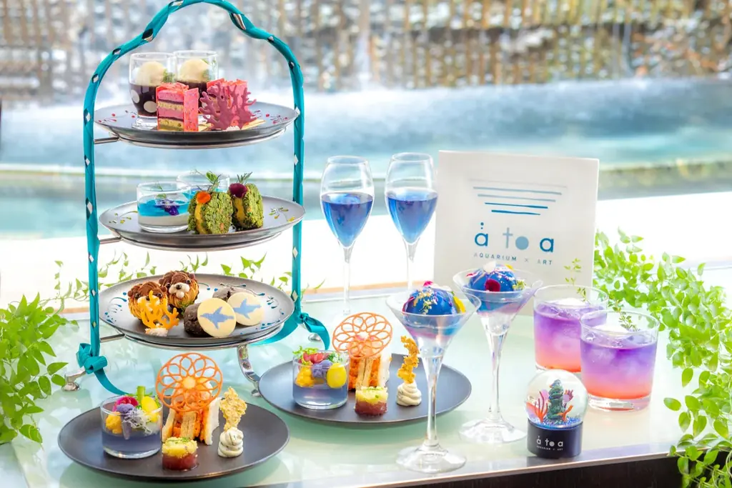 神戸ポートピアホテルのティーラウンジ「ベルクール」は、2026年4月27日(月)から6月28日(日)まで、劇場型アクアリウム「AQUARIUM×ART àtoa(以下:アトア)」との初のコラボレーションによるアフタヌーンティーセットを期間限定で販売します。今回の企画は、ホテルとアトア双方の周年を記念する取り組みとして実施され、アトアの持つ幻想的な光と水の表情を、ホテルパティシエの手でスイーツとセイボリーに落とし込みました。