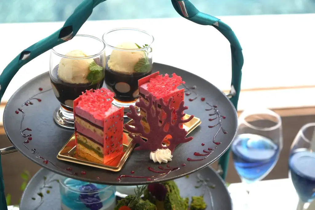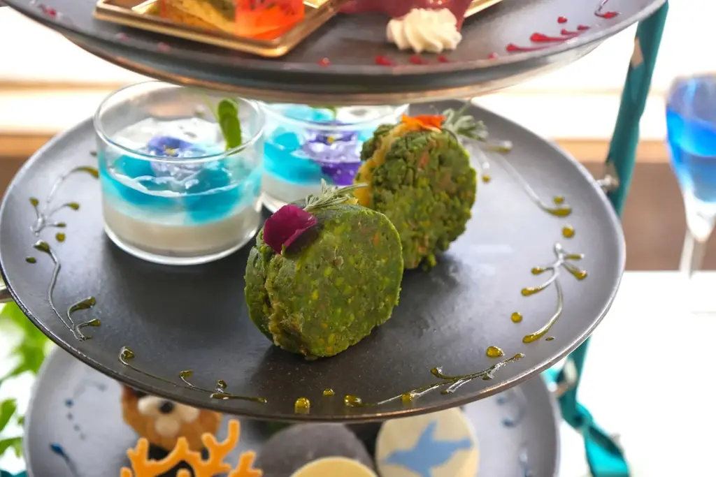 本セットは、ホテルシェフとパティシエがアトアの各フロアに広がる世界観を丁寧に分解し、スイーツやセイボリー8種類のスイーツと4種類のセイボリーで表現しています。ティースタンドは上段・中段・下段の構成で、それぞれがアトアのフロアや代表的な生きものをモチーフに仕立てられています。