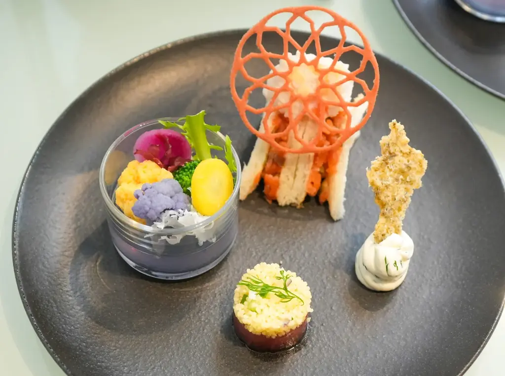 - スモークサーモンサンド(ビーツ香るラングドシャ飾り)/花野菜のアクアリウムサラダ/マグロのタルタルとクスクスのガトー仕立て/海苔のガレット(ディル香るクリームチーズ添え)