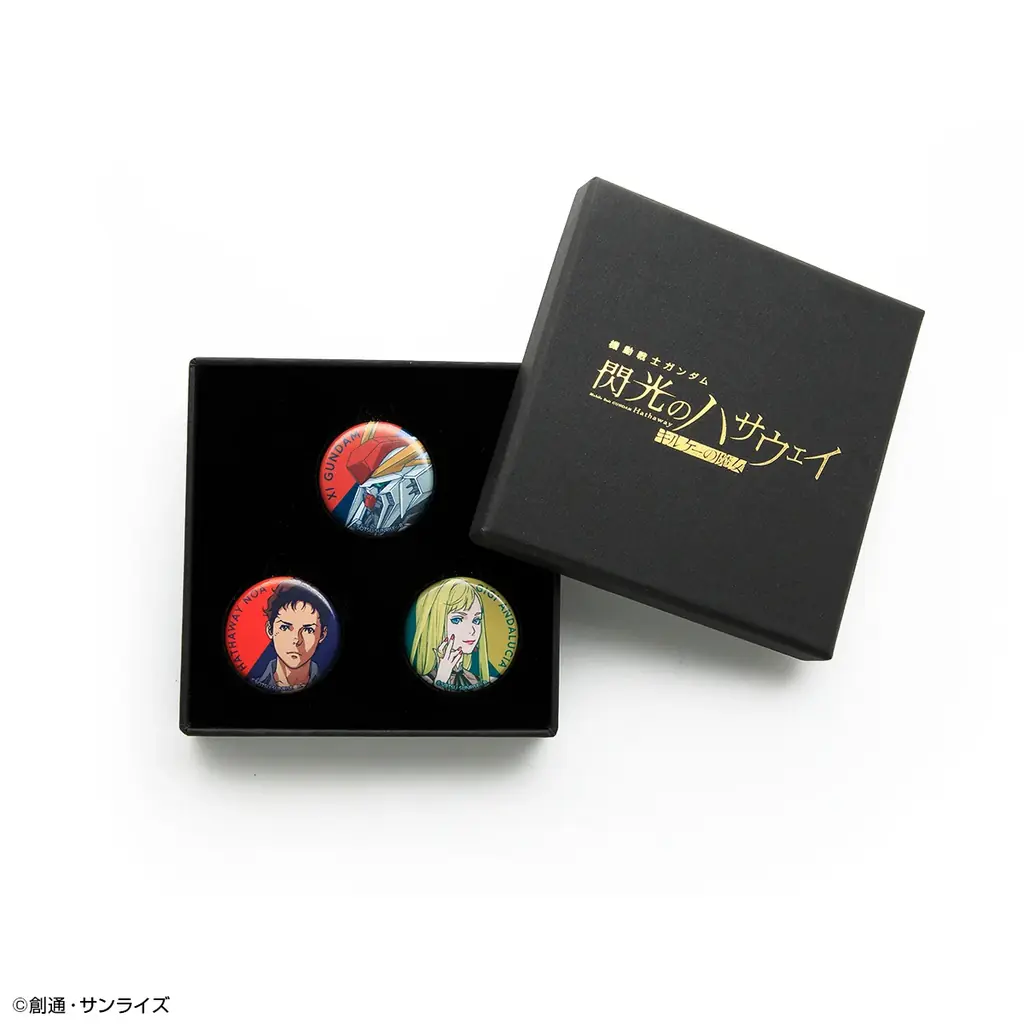 缶バッジセットは、ハサウェイ・ノア、ギギ・アンダルシア、Ξガンダムのデザインによる缶バッジ3種セットです。MA-1のアクセントとしての利用が想定されています。価格は1,980円(税込)で、缶バッジ直径はΦ32mm、BOXサイズは50mm×100mm、表面素材はポリエステルです。購入URLを記載します。