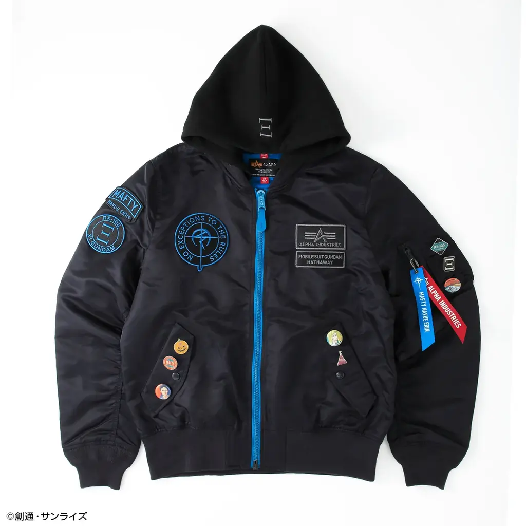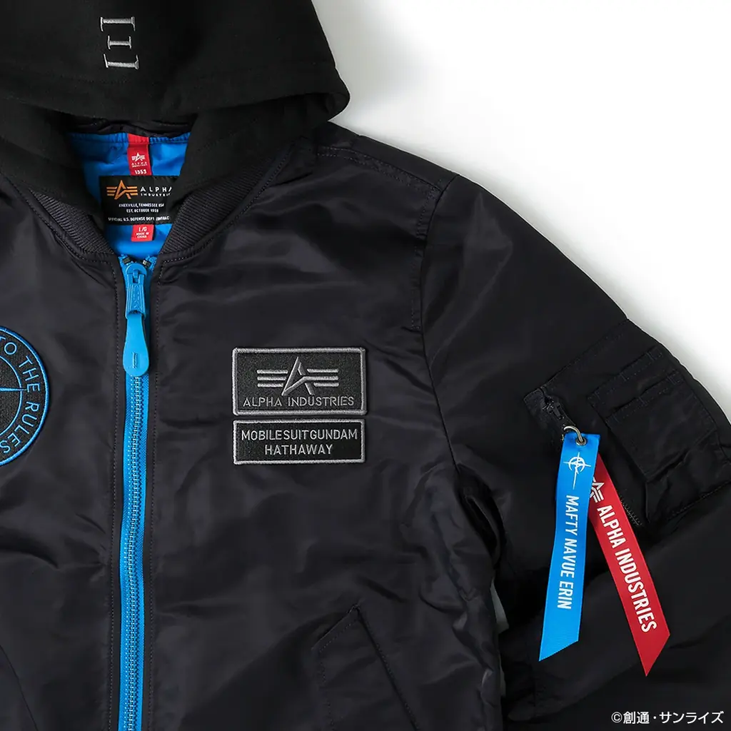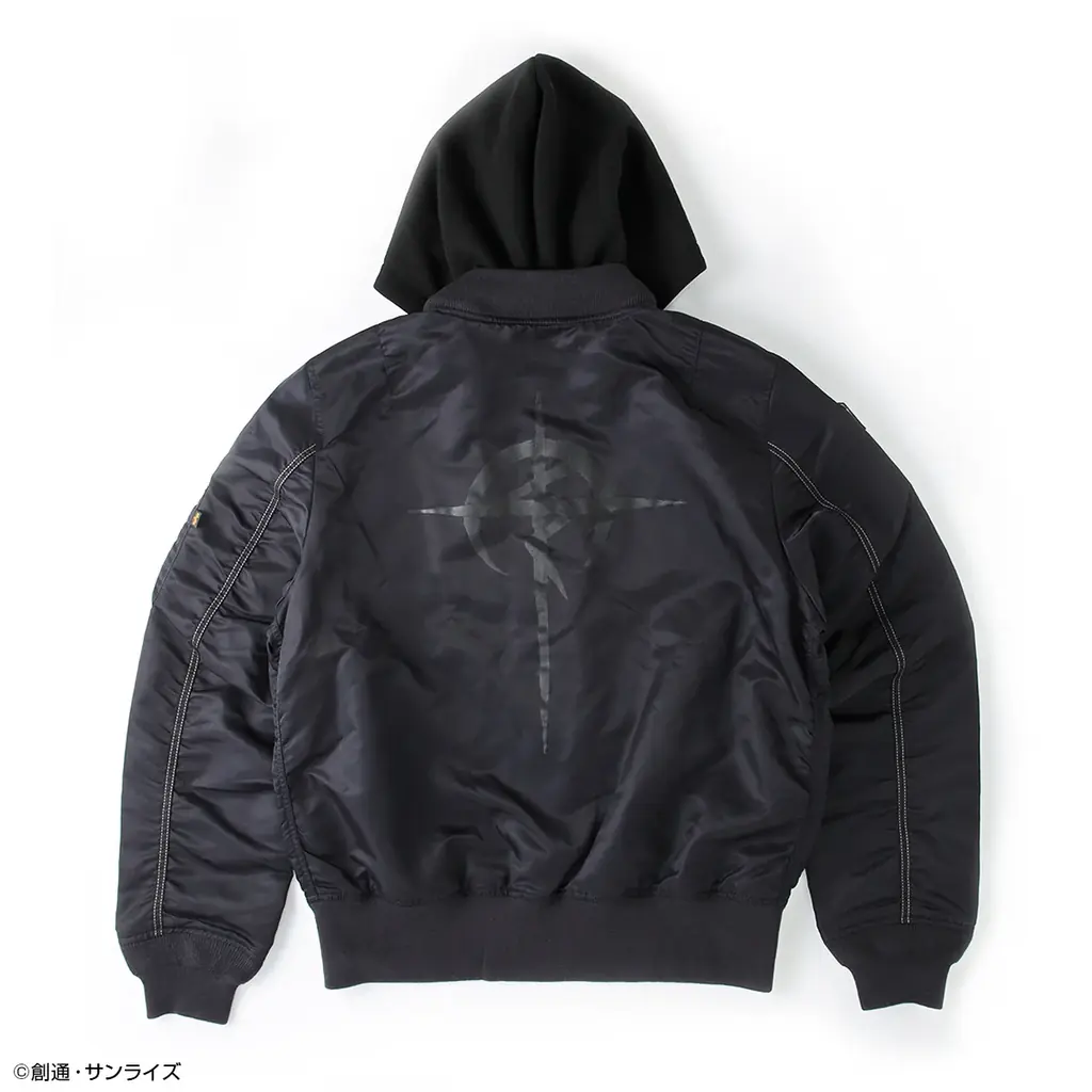 外観はブラックを基調にセルリアンブルーのジッパーを採用し、劇中のパイロットスーツを想起させる意匠が随所に配されています。背面のマフティーマークにはリフレクター素材を使用しており、ディテールへのこだわりが反映されています。着脱可能なフードを備え、現代風のシルエットへと落とし込まれています。