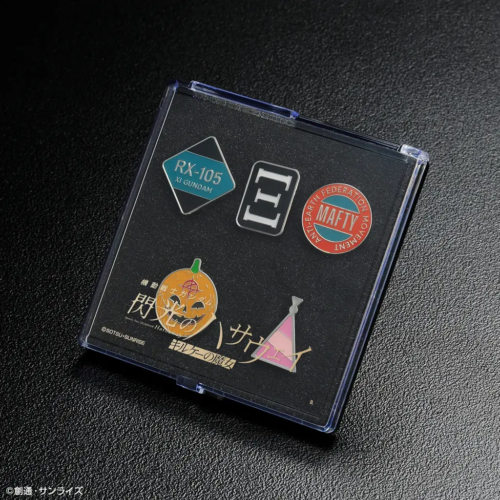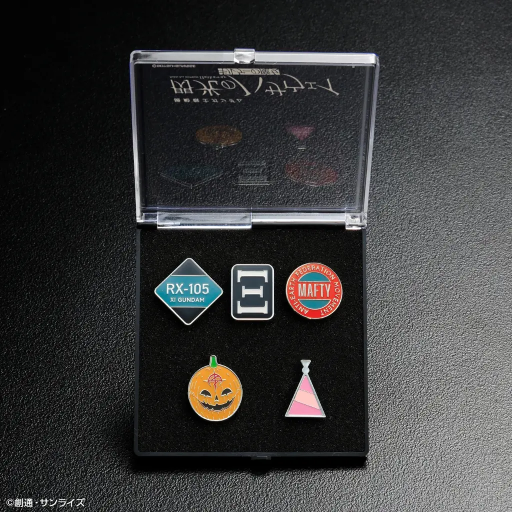 ピンズセットはΞガンダムのΞマーク、Ξガンダム型式、マフティー、偽マフティー、ギギのイヤリングをモチーフにした5種セットで、価格は5,500円(税込)です。ピンズ本体は約35mm、ケースはW120×H120×D18mm、素材は亜鉛合金です。こちらも購入URLを併記します。