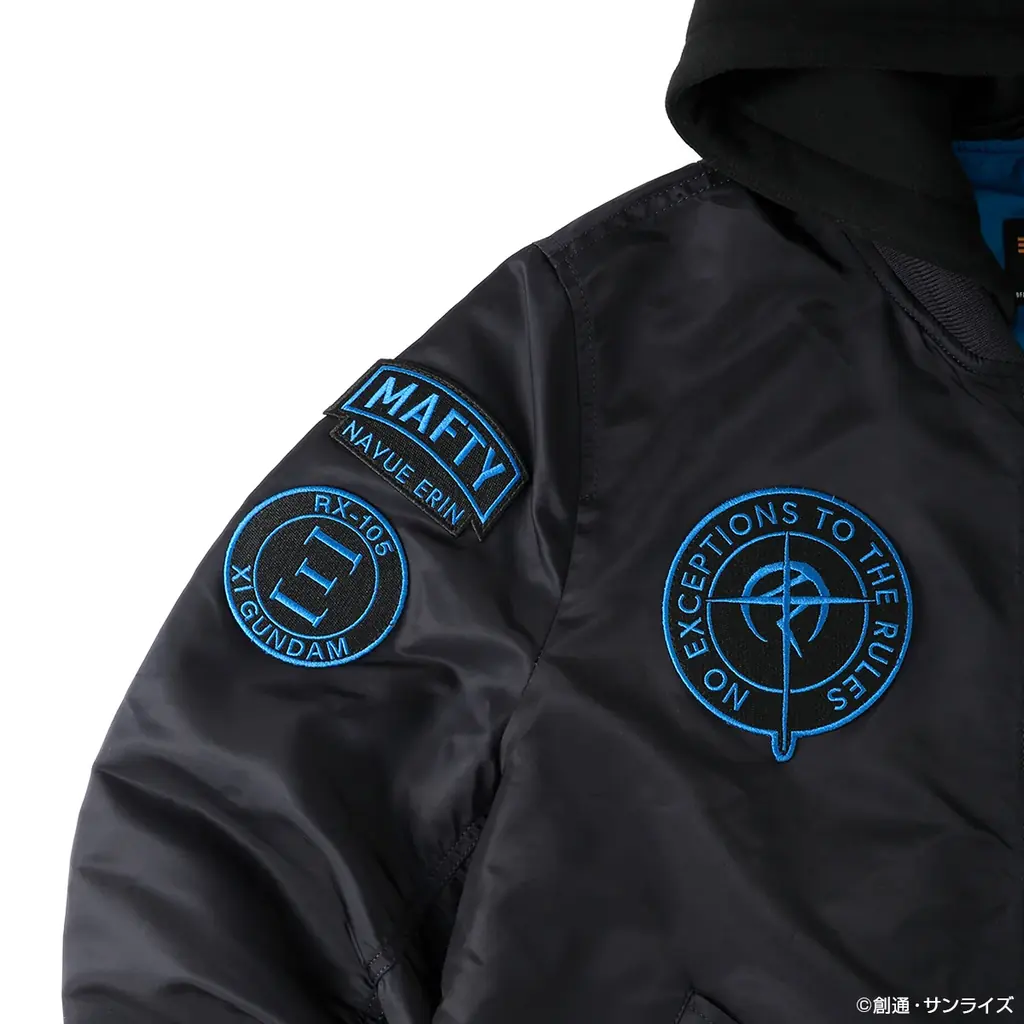 デザインでは本体がブラック、ジッパーや文字・型式番号をセルリアンブルーで統一し、袖裏にイエローステッチを加えて劇中のパイロットスーツをイメージさせる配色となっています。背面に配されたマフティーマークはリフレクター素材で表現されています。