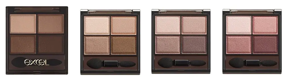 - スキニーリッチシャドウ N:エクセルを代表する看板アイテムで、2026年2月にリニューアル。肌なじみの良いブラウン~ベージュ系の色だけで構成され、色とツヤが溶け合う極上の4色パレットである。