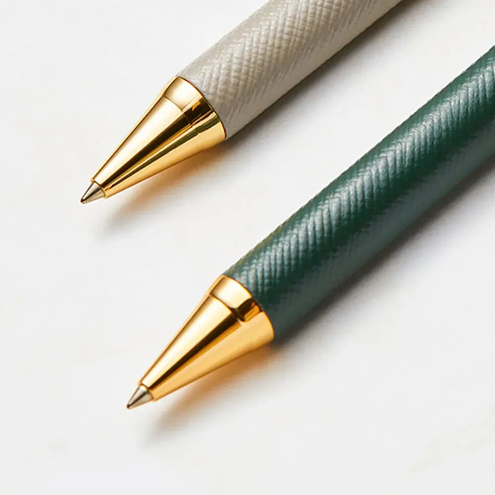 『ロトロ』は重量感のある真鍮製ボディに牛革のシートを丁寧に巻き付けて仕上げた筆記具です。素材の組み合わせと仕上げの良さが、手にしたときの満足感を高めます。