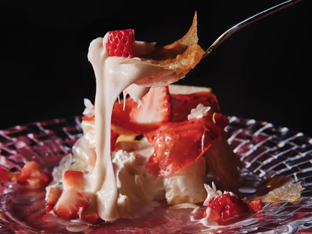 本バーで提供される「苺バリッ福」は、単に甘さや見た目だけを訴求するのではなく、食感の移り変わりを楽しませるよう設計されています。ホテル専属シェフのフレンチの技術と独自の審美眼を反映し、フォークが止まらない最後の一口までの体験を目指した構成です。