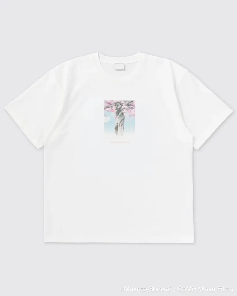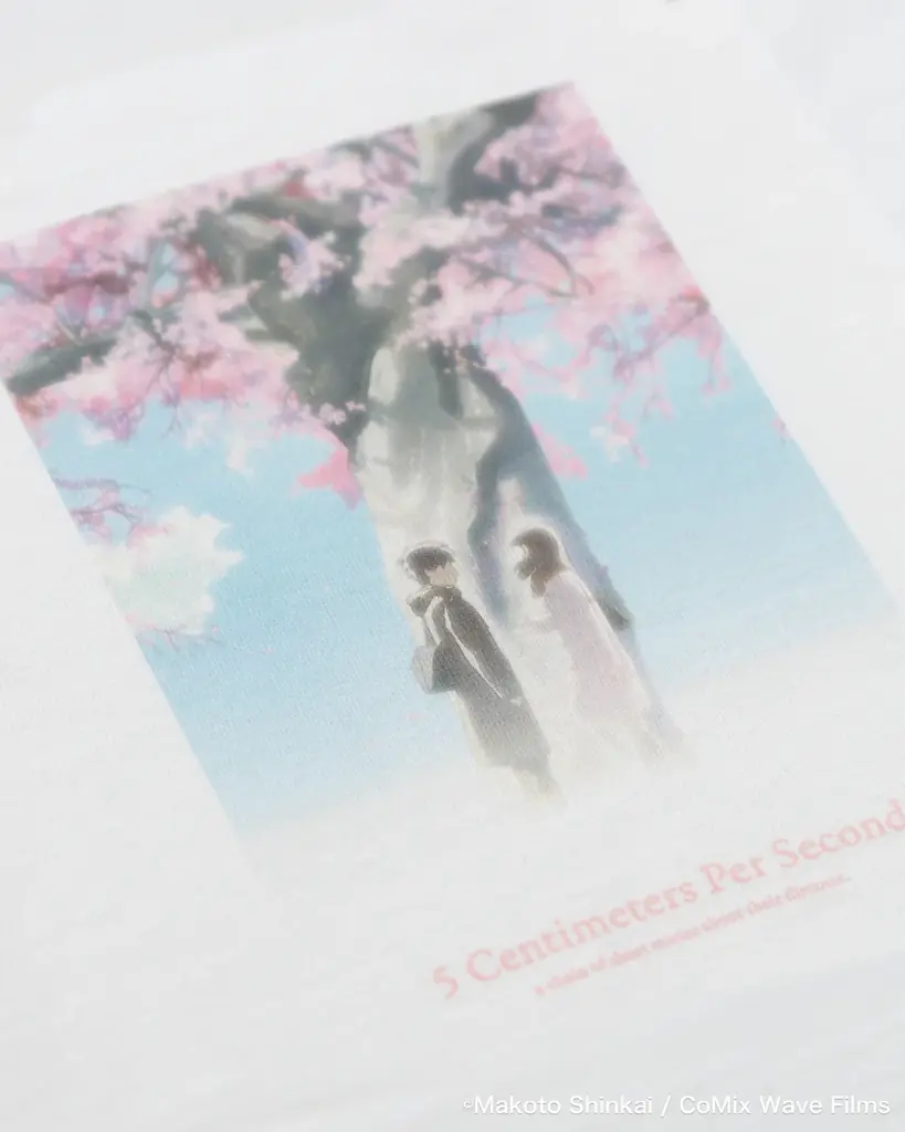 第一話「桜花抄」の象徴的な場面、岩舟駅近くの桜の木の下で明里が貴樹に語りかけるシーンを切り取ったプリントが特徴です。生地には厚み・質感・柔らかさのバランスにこだわった上質な綿天竺を採用しています。