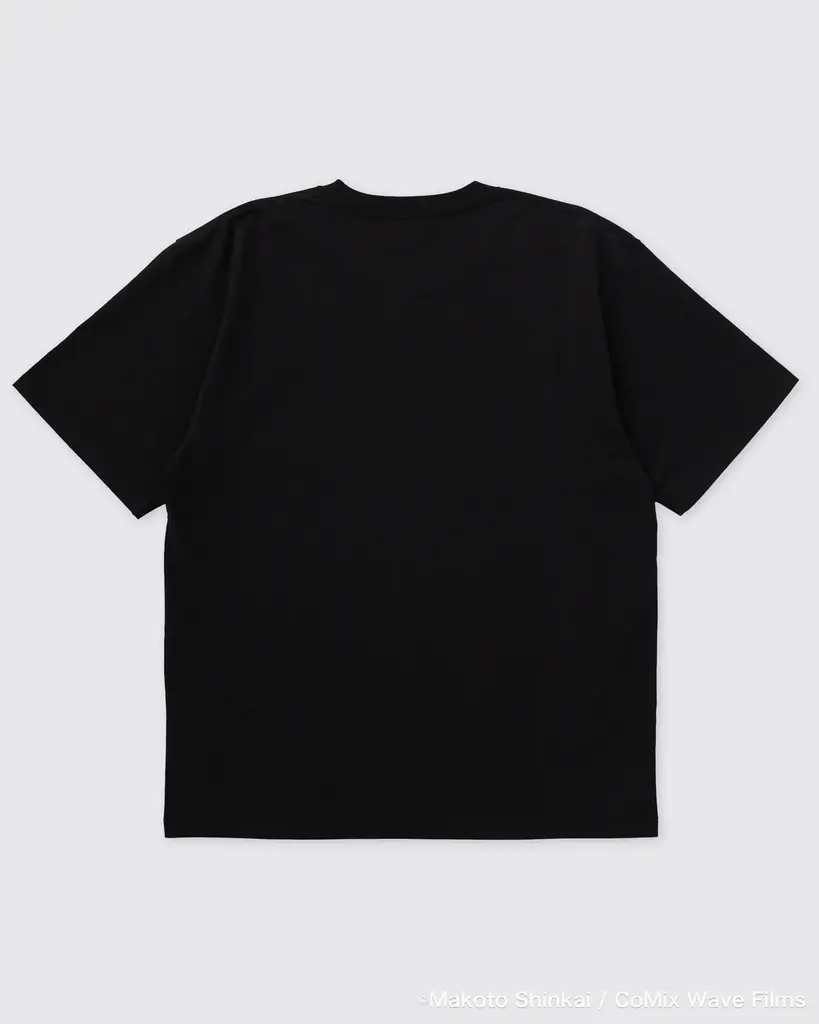 第2話「コスモナウト」のポスタービジュアルより、ロケットの打ち上げを見上げる高校生の花苗と貴樹を後ろから捉えたビジュアルをプリントデザインに使用しています。Tシャツ本体はブラックボディに、空のグラデーションが自然に溶け込むようにブラックマジックのインクジェットプリントで表現しました。