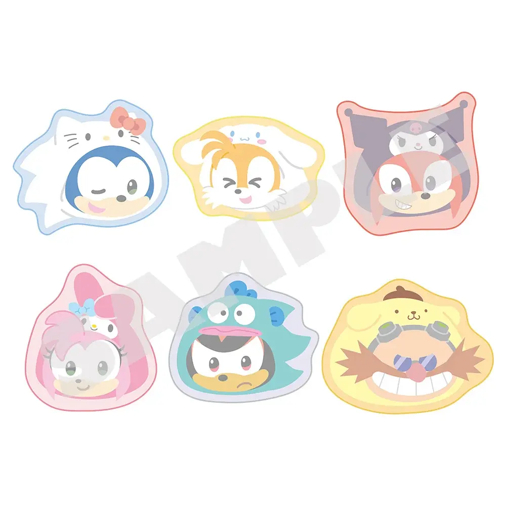 | ダイカットハンドタオル | 全6種 | ¥1,650 | ソニック×ハローキティ、テイルス×シナモロール、ナックルズ×クロミ、エミー×マイメロディ、シャドウ×ハンギョドン、Dr.エッグマン×ポムポムプリンの6種。 |