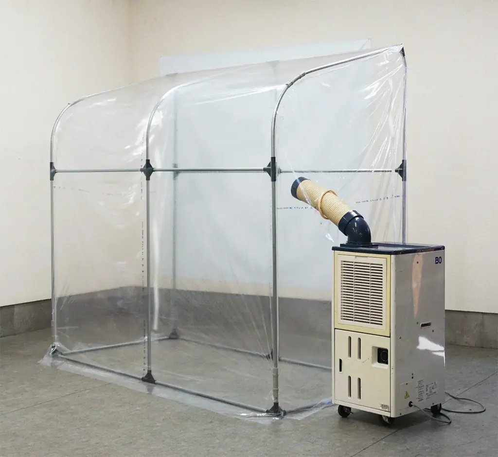 - 冷えルームテント(テントのみ):国内生産の骨組みと0.3mm厚の方眼仕様・防炎帯電防止仕様のビニールを使用。サイズはW1350×D2140×T2140mm。テント本体に穴を開ければ既存のスポットクーラーでも使用可能。