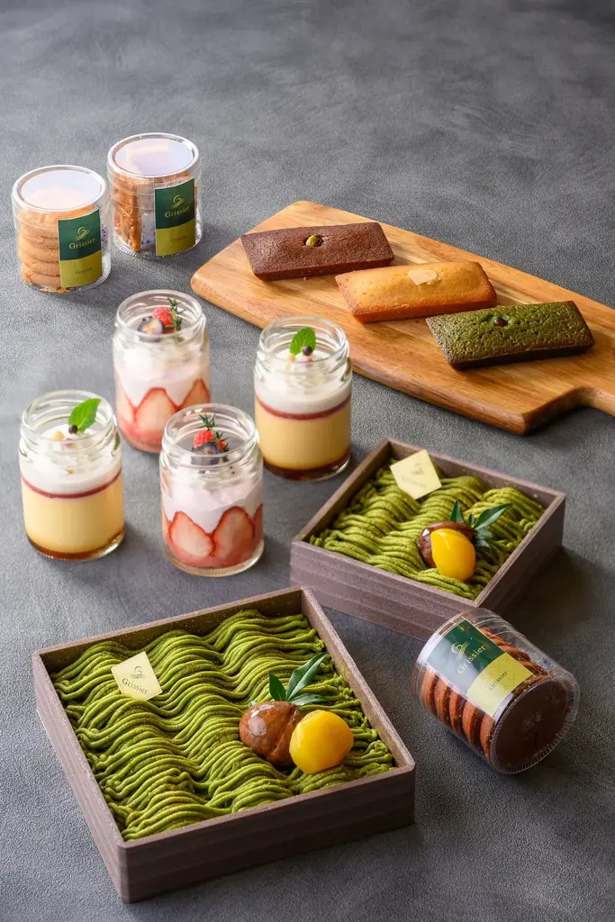 Grissierは三重県産食材を使用した焼き菓子や洋菓子を中心に、多彩な商品を持ち込みます。フィナンシェ各種や伊勢茶を用いたモンブラン、プリンやティラミスなど、素材の個性を生かした商品構成です。特に「折詰伊勢茶モンブラン」は上質な三重県産伊勢茶をふんだんに使用した商品で、抹茶の深い香りとほろ苦さを活かしたクリームを重ねることで見た目にも華やかな高級感を備えています。