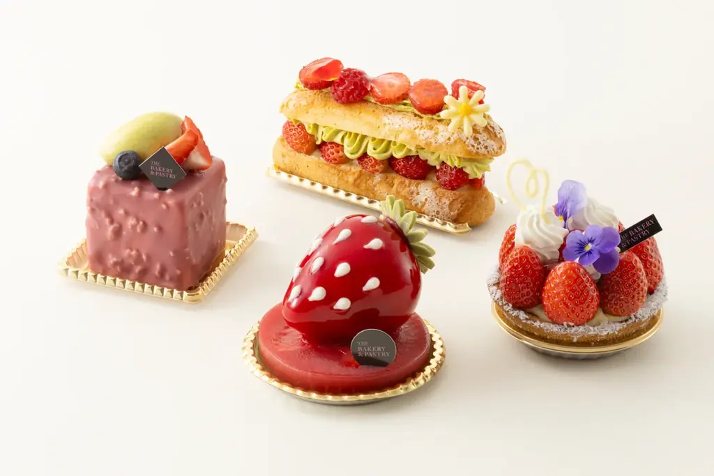 ホテルショップ ザ・ベーカリー&ペイストリー(東館1階)では、お祝いの席や自宅でのリラックスタイムに向けたテイクアウト可能なスイーツとブレッドを用意。苺とピスタチオを取り入れた商品が店頭に並びます。価格は税込で表示されています。