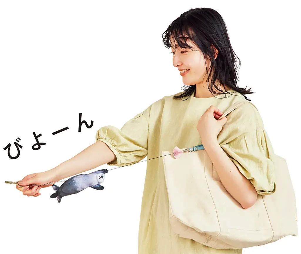 使い方はシンプルで、内側のチェーンに鍵を取り付けて保管します。バッグの内側でキーポーチがスタンバイする状態から、必要なときにリールを伸ばして鍵を使い、使用後はリールが巻き戻って本体に収まる仕組みです。リールの伸縮によりラッコがジャンプする仕草が視覚的に表現されます。
