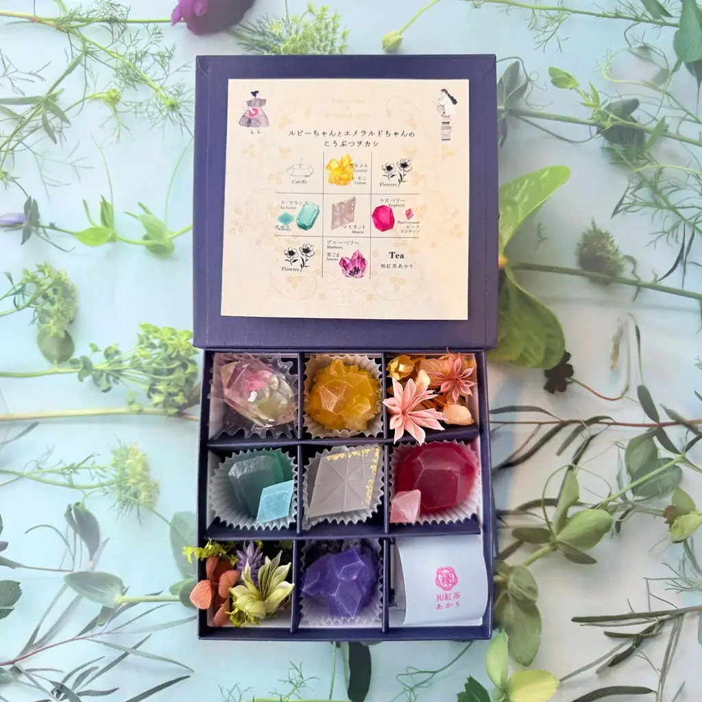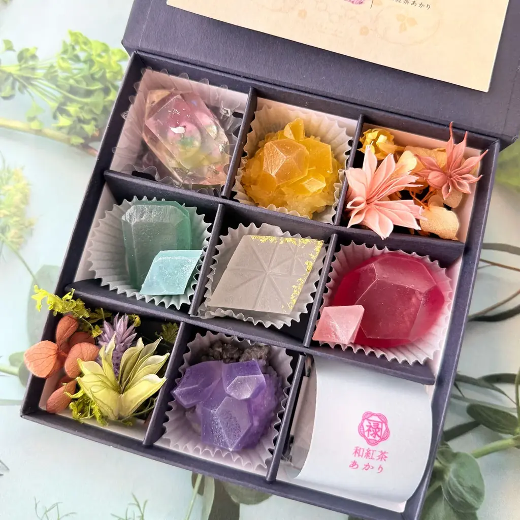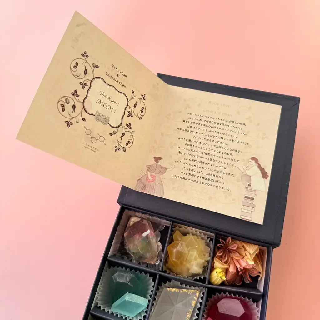 「こうぶつヲカシ 9粒箱」は宝石や水晶をイメージした琥珀糖を中心に、和紅茶のティーバッグ、鉱物型のジェルキャンドル、彩りのドライフラワーをセットにしたギフト。開封した瞬間に宝石箱のようなときめきを届ける構成で、姉妹の物語と母へのメッセージが添えられる。