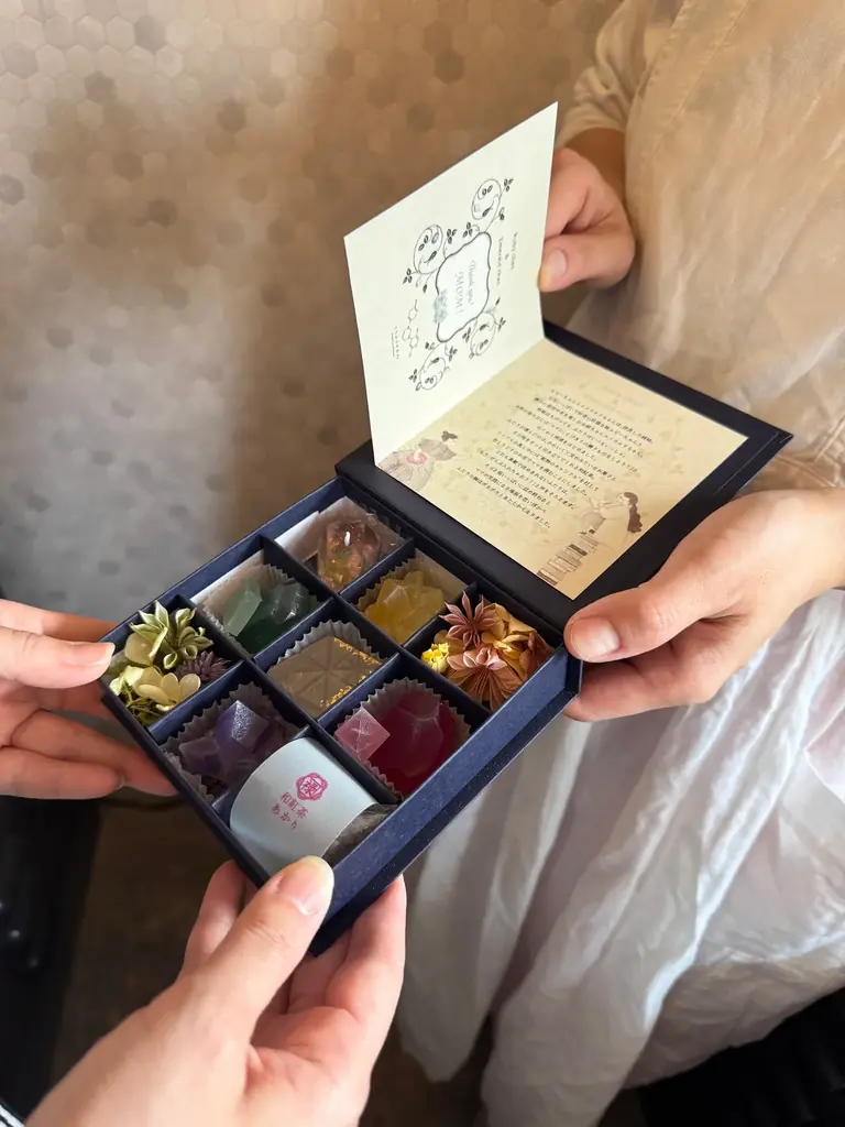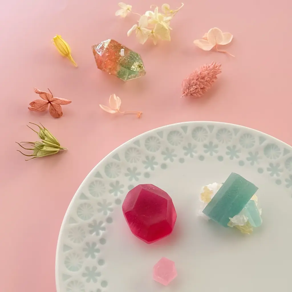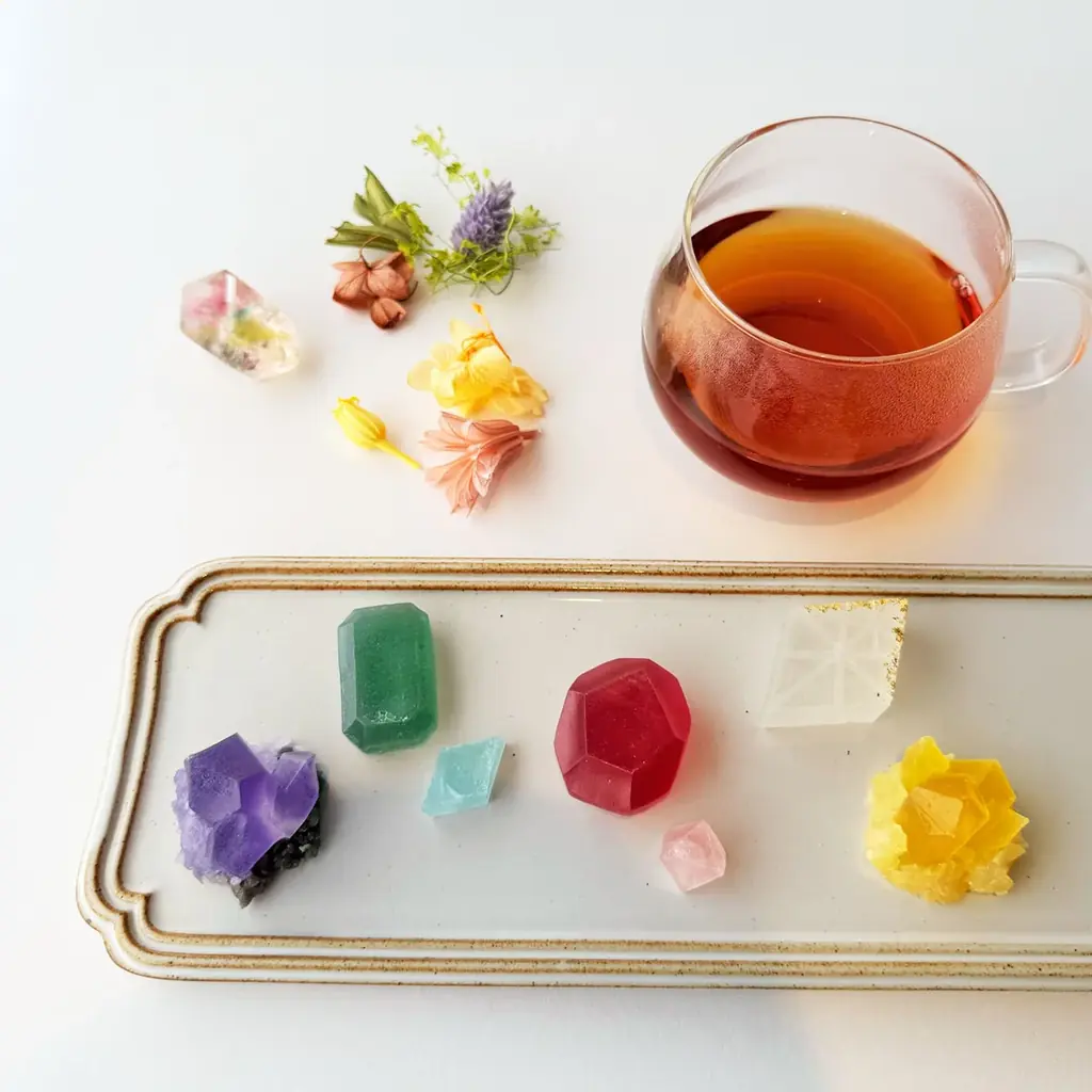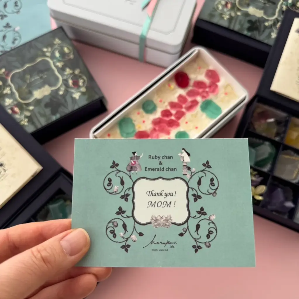 「こうぶつヲカシ 9粒箱」は宝石や水晶をイメージした琥珀糖を中心に、和紅茶のティーバッグ、鉱物型のジェルキャンドル、彩りのドライフラワーをセットにしたギフト。開封した瞬間に宝石箱のようなときめきを届ける構成で、姉妹の物語と母へのメッセージが添えられる。