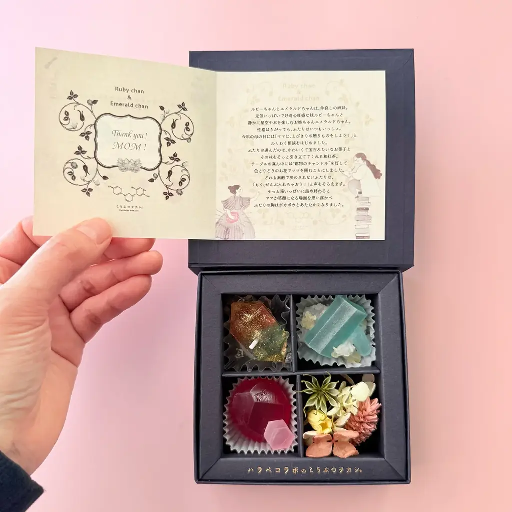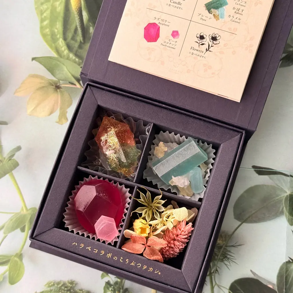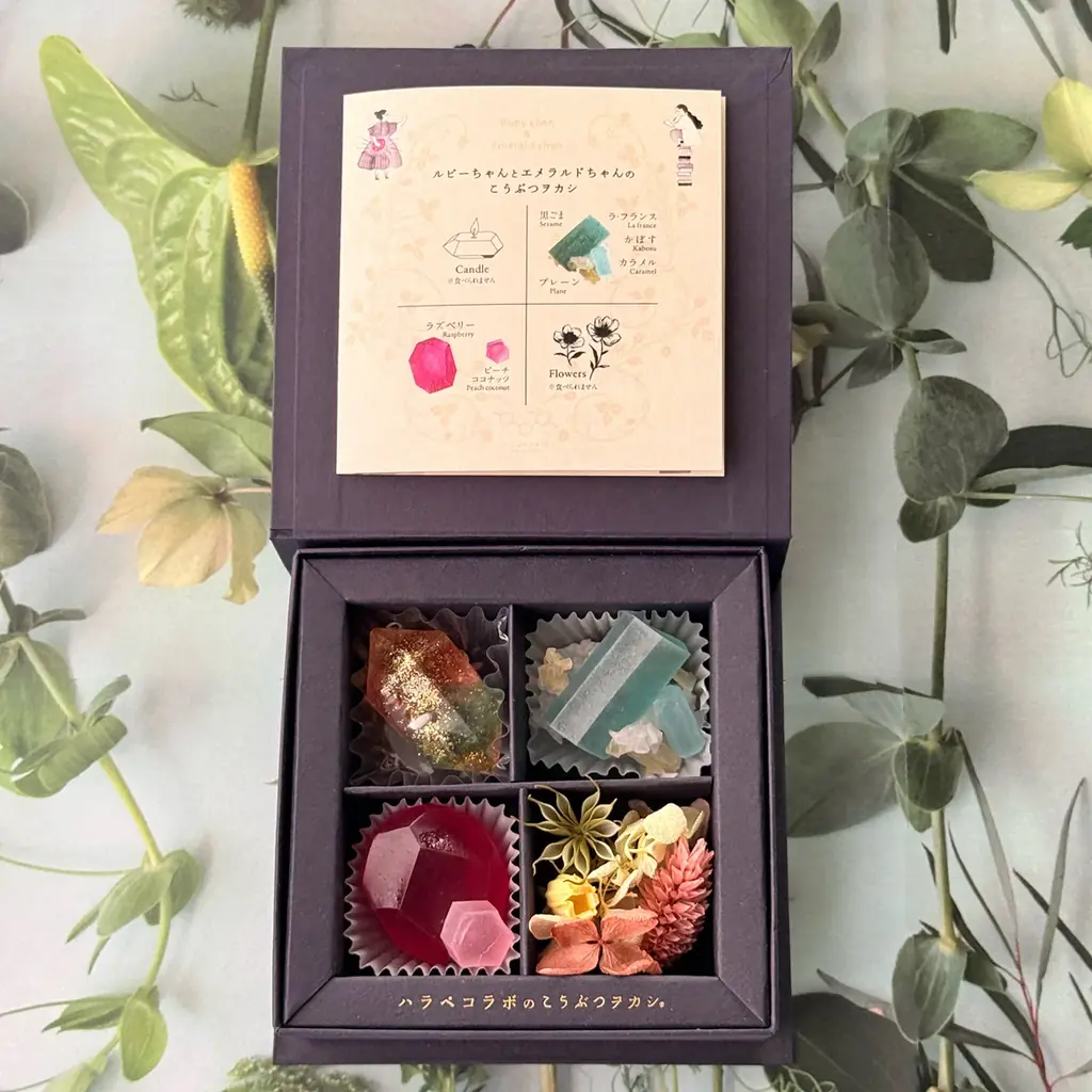 小ぶりなギフトを希望する場合の選択肢が4粒箱。ルビーとエメラルドをイメージした琥珀糖2粒に、鉱物型ジェルキャンドルとドライフラワーを添え、可愛らしさを強調した仕様だ。贈る側の気持ちを手軽に伝えられる構成となっている。