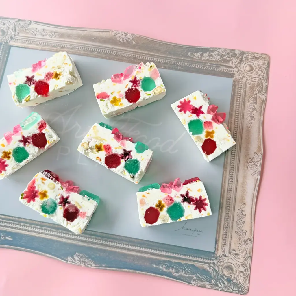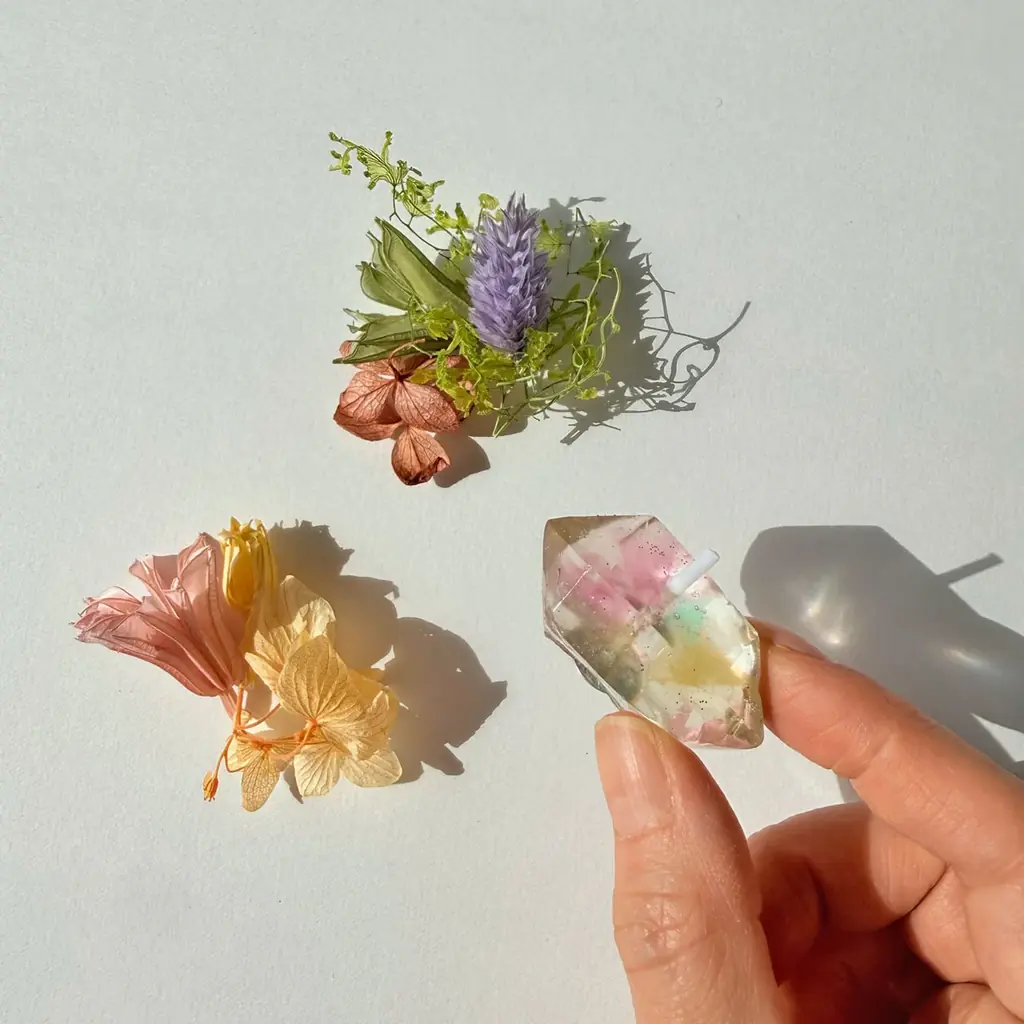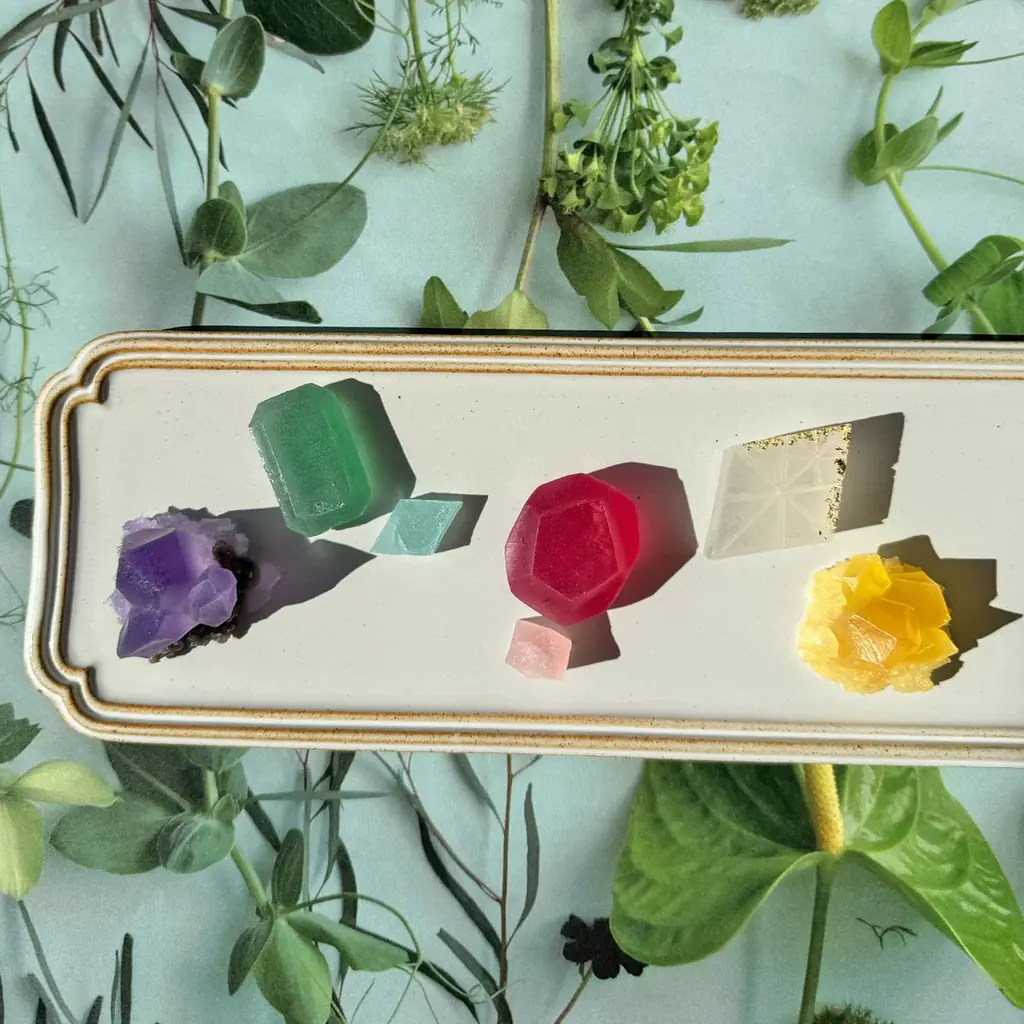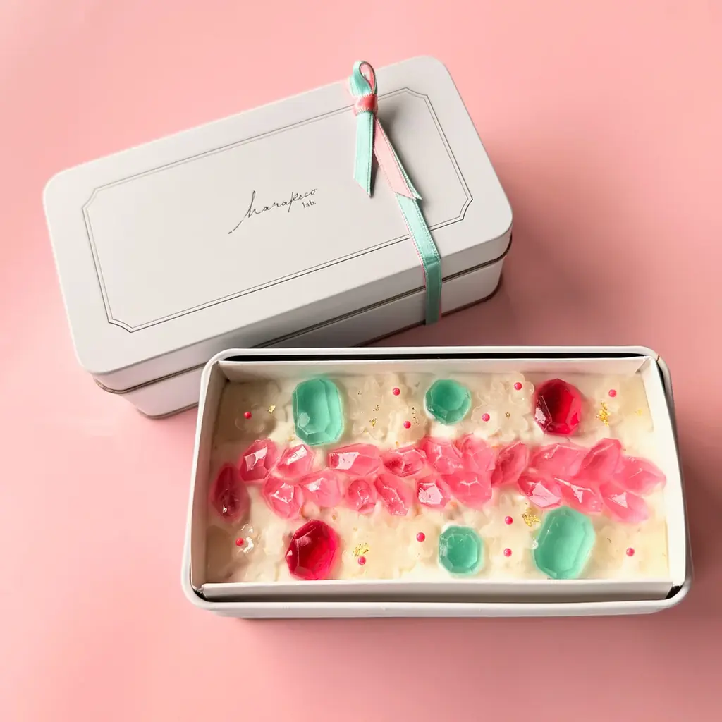 小ぶりなギフトを希望する場合の選択肢が4粒箱。ルビーとエメラルドをイメージした琥珀糖2粒に、鉱物型ジェルキャンドルとドライフラワーを添え、可愛らしさを強調した仕様だ。贈る側の気持ちを手軽に伝えられる構成となっている。
