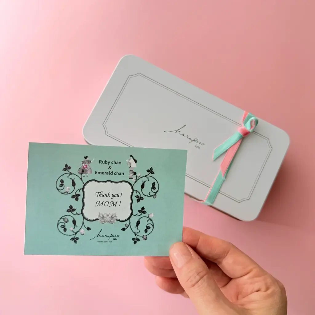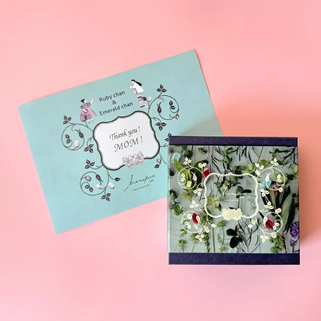 | 主要同梱物 | 和紅茶ティーバッグ(9粒箱のみ)、鉱物型ジェルキャンドル、ドライフラワー、母の日メッセージペーパー(こうぶつヲカシ)、母の日カード(カッサータ)、オリジナル母の日シール |