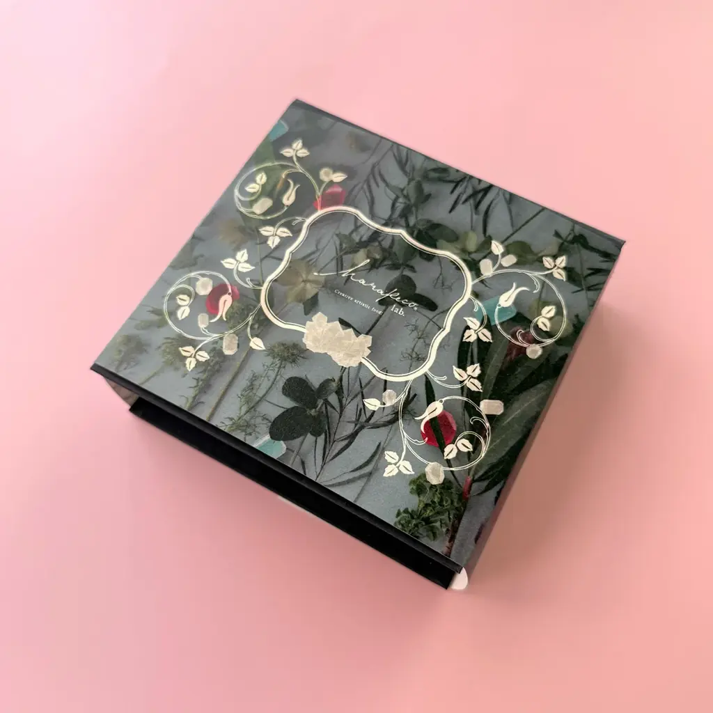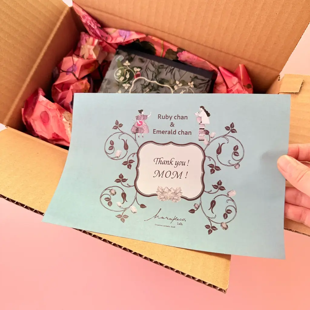 箱にはお菓子と物語をイメージしたスリーブが巻かれ、母の日メッセージペーパーが同梱される。ドライフラワーとキャンドルには透明プラスチック製カバーを掛けての配送となる。