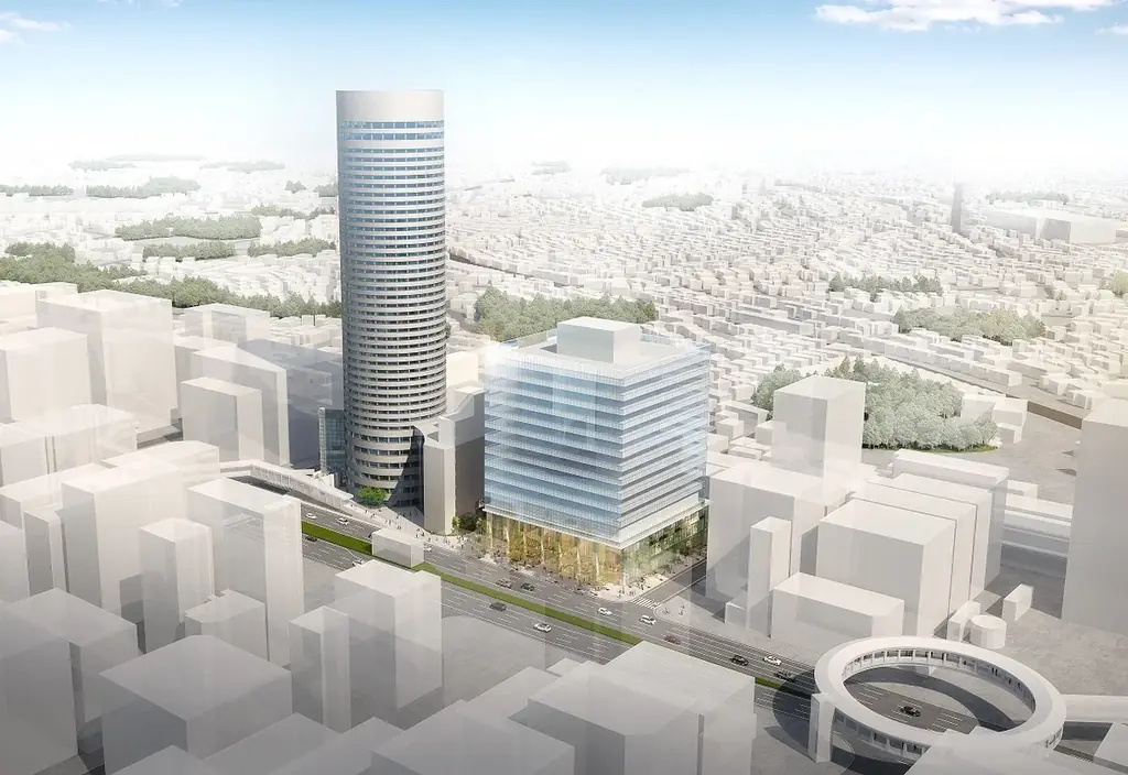 計画段階の完成イメージでは、左側にマクニカ新社屋、右側に新横浜プリンスホテルが配置される想定となっており、敷地間のアクセスルートや公開空間の整備により、地域住民や来訪者が立ち寄りやすい動線を確保することが目標とされている。