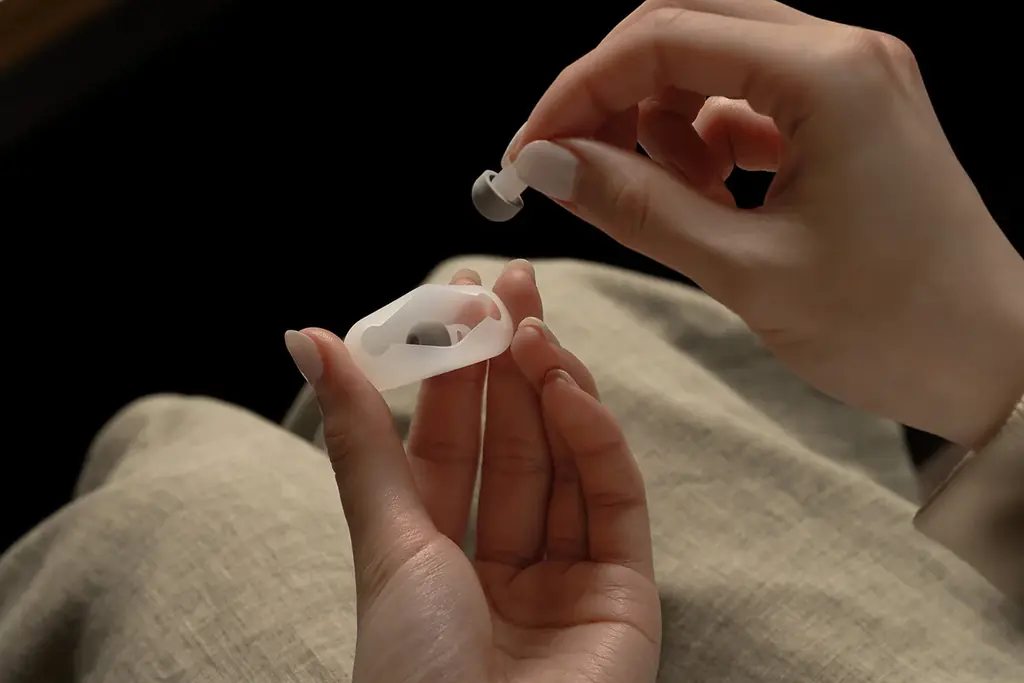 今回の製品は「耳の奥を塞がない」「耳穴に蓋をする」という新しい着想を取り入れた極小設計を採用しています。耳に触れる部分を最小限にすることで閉塞感を軽減し、柔らかいシリコン素材の採用により長時間装着しても疲れにくく、横向きに寝ても負担を感じにくい構造になっている点が特長です。