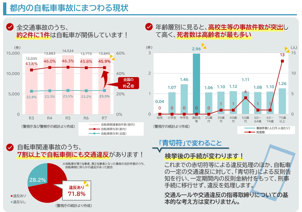 | 背景データ | 都内の自転車関連事故は全交通事故の約46%、自転車側の違反割合は70%以上(近年の傾向) |