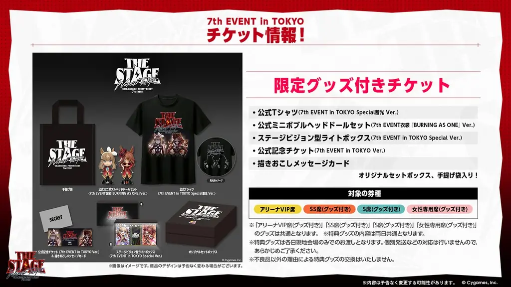 グッズ付きのチケットには、公式Tシャツ(7th EVENT in TOKYO Special 蓄光Ver.)、公式ミニボブルヘッドドールセット(7th EVENT 衣裳『BURNING AS ONE』Ver.)、公式ステージビジョン型ライトボックス(Special Ver.)、公式記念チケット(7th EVENT in TOKYO Ver.)、描きおこしメッセージカードなどが含まれます。これらは各日現地会場での受取となり、個別発送は行われません。