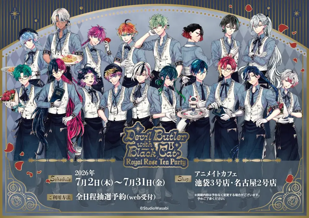 アニメイトカフェ池袋3号店と名古屋2号店では、『悪魔執事と黒い猫』 -Royal Rose Tea Party- と題したコラボが、2026年7月2日から7月31日まで実施されます。コラボは全日程抽選予約制で、Webからの受付が必要です。