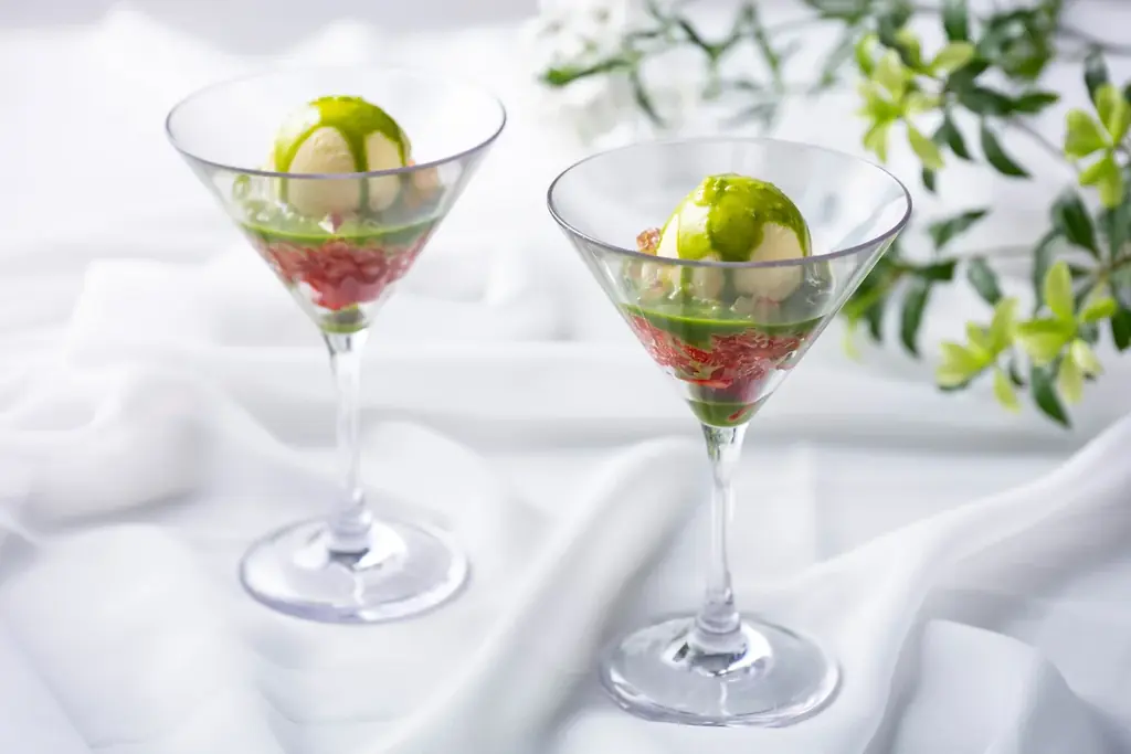 - 抹茶といちごのヴェリーヌ — バニラ風味のババロア、いちごソース、抹茶ゼリーの層で甘みとほろ苦さを表現。
